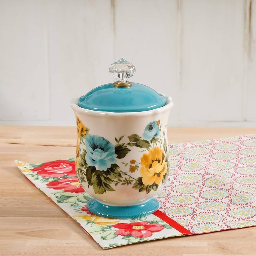 Hũ đựng đồ khô The Pioneer Woman Vintage Floral Canister w lý tưởng để đựng cà phê, trà, bột mì, Lớp nền đẹp mắt có màu xanh mòng két rực rỡ và những bông hoa màu