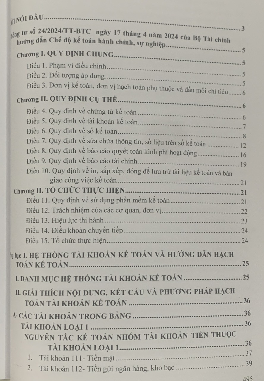 Ngày 17 tháng 4 năm 2024, Bộ Tài chính ban hành Thông tư số 24/2024/TT-BTC hướng dẫn Chế độ kế toán hành chính, sự nghiệp gồm: chứng từ kế toán, tài khoản kế toán, sổ kế toán, báo cáo quyết toán kinh phí hoạt động, báo cáo tài chính; quy trình in, sắp xếp, đóng để lưu trữ tài liệu kế toán của các đơn vị. Đối tượng được áp dụng cho các đơn vị kế toán, bao gồm: Cơ quan nhà nước (trừ Ủy ban nhân dân xã, phường, thị trấn sử dụng ngân sách cấp xã); Đơn vị sự nghiệp công lập; Tổ chức chính trị; tổ chức chính trị - xã hội; Mặt trận Tổ quốc Việt Nam và tổ chức, cơ quan, đơn vị khác là đơn vị sử dụng ngân sách nhà nước; Tổ chức, cơ quan, đơn vị thực hiện cơ chế tài chính của đơn vị sự nghiệp công lập.