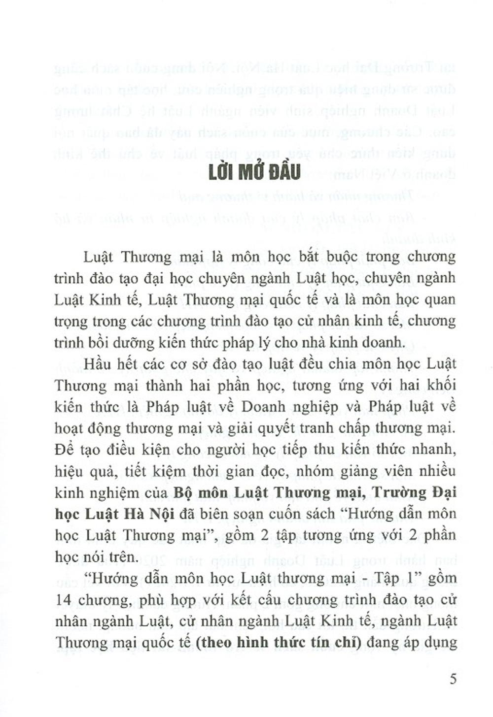 Hầu hết các cơ sở đào tạo luật đều chia môn học Luật thương mại thành 2 phần học,tương ứng với hai khối kiến thức là pháp luật về doanh nghiệp và pháp luật về hoạt động thương mại. Để tạo điều kiện cho người học tiếp thu kiến thức nhanh, hiệu quả, tiết kiệm thời gian đọc,nhóm giảng viên nhiều kinh nghiệm của bộ môn Luật thương mại trường Đại học Luật Hà Nội đã biên soạn cuốn sách "Hướng dẫn môn học luật thương mại" gồm 2 tập tương ứng với 2 phần học nói trên
