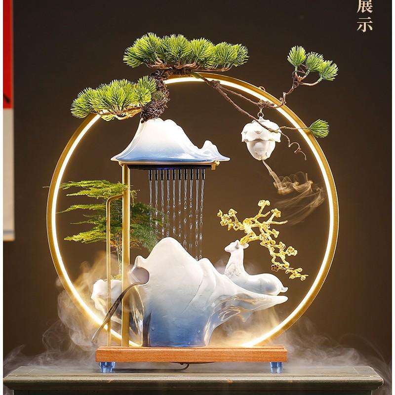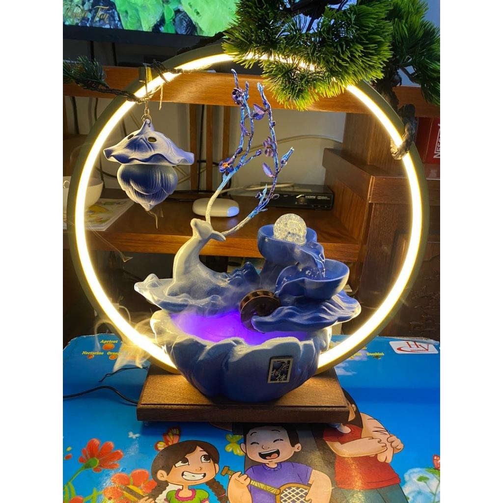 Thác nước phong thuỷ tượng hươu xanh đỏ , thác khói trầm hương kèm kệ đèn led hào quang trang trí
