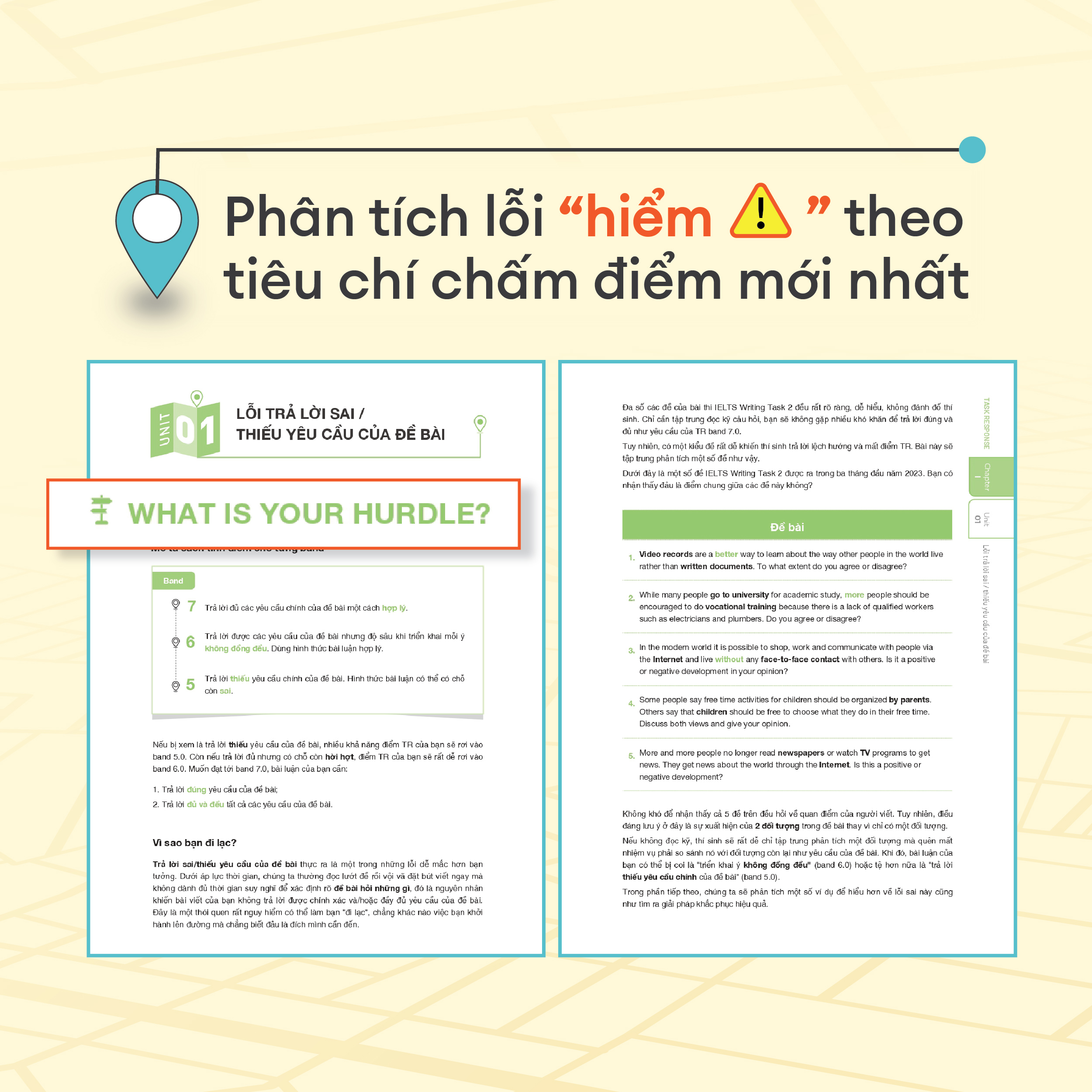 Sách được bố cục theo trật tự của Bảng tiêu chí chấm IELTS Writing Task 2 dành cho các band điểm phổ biến nhất là 5.0, 6.0 và 7.0. Bốn chương đầu sẽ dẫn dắt bạn đi qua 4 tiêu chí: Task Response, Coherence and Cohesion, Lexical Resource, và Grammatical Range and Accuracy; chương V sẽ hướng dẫn bạn thực hành tất cả các bước khi viết một bài luận hoàn chỉnh sao cho tránh được những lỗi đã phân tích trong bốn chương trước đó.