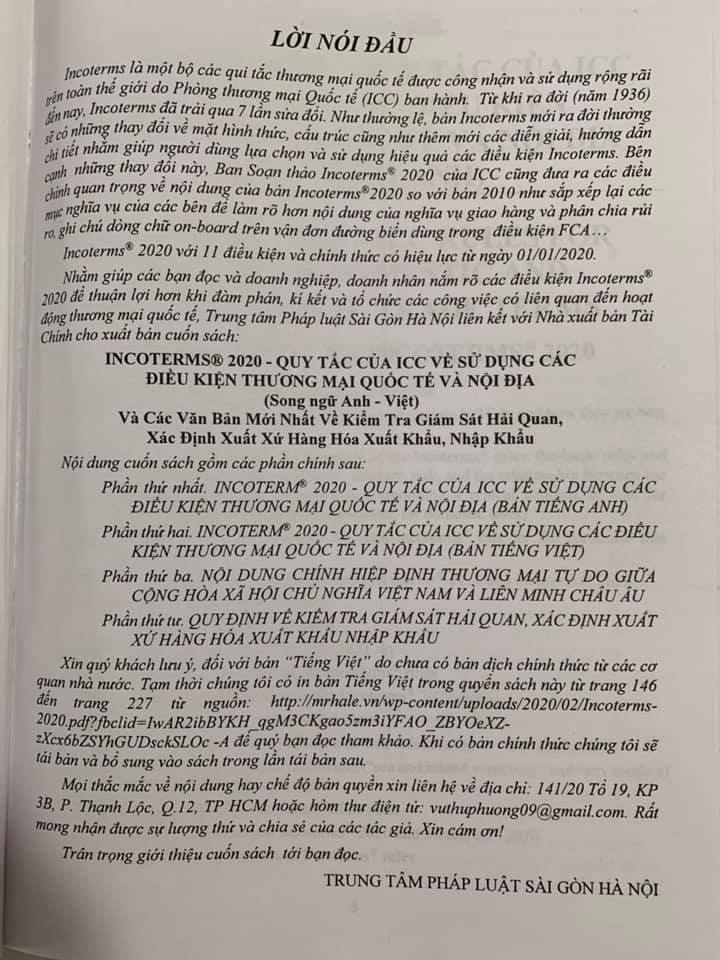 Nhằm giúp các bạn đọc và doanh nghiệp, doanh nhân nắm rõ các điều kiện Incoterms 2020 để thuận lợi hơn khi đàm phán, kí kết và tổ chức các công việc có liên quan đến hoạt động thương mại quốc tế, Trung tâm Pháp luật Sài Gòn Hà Nội liên kết với Nhà xuất bản Tài Chính cho xuất bản cuốn sách: