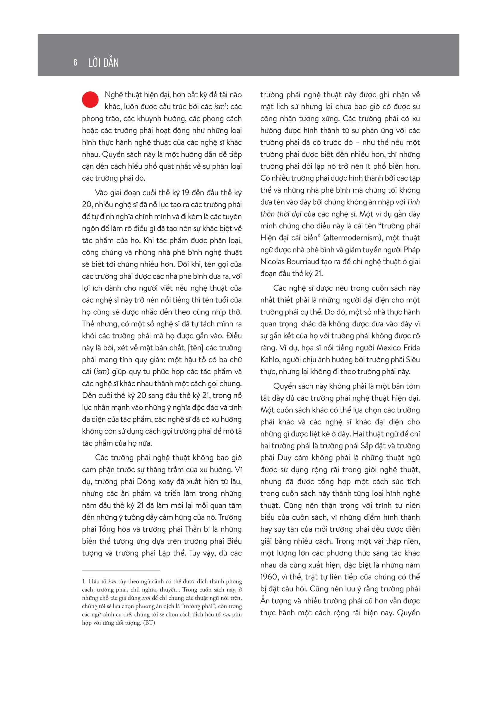 Nghệ thuật hiện đại, hơn bất kỳ đề tài nào khác, luôn được cấu trúc bởi các ism: các phong trào, các khuynh hướng, các phong cách hoặc các trường phái hoạt động như những loại hình thực hành nghệ thuật của các nghệ sĩ khác nhau. Cuốn sách cho chúng ta thấy rằng nghệ thuật hiện đại và hậu hiện đại thay đổi quá nhanh chóng, khác hẳn nghệ thuật hàn lâm và thời kỳ phục hưng.