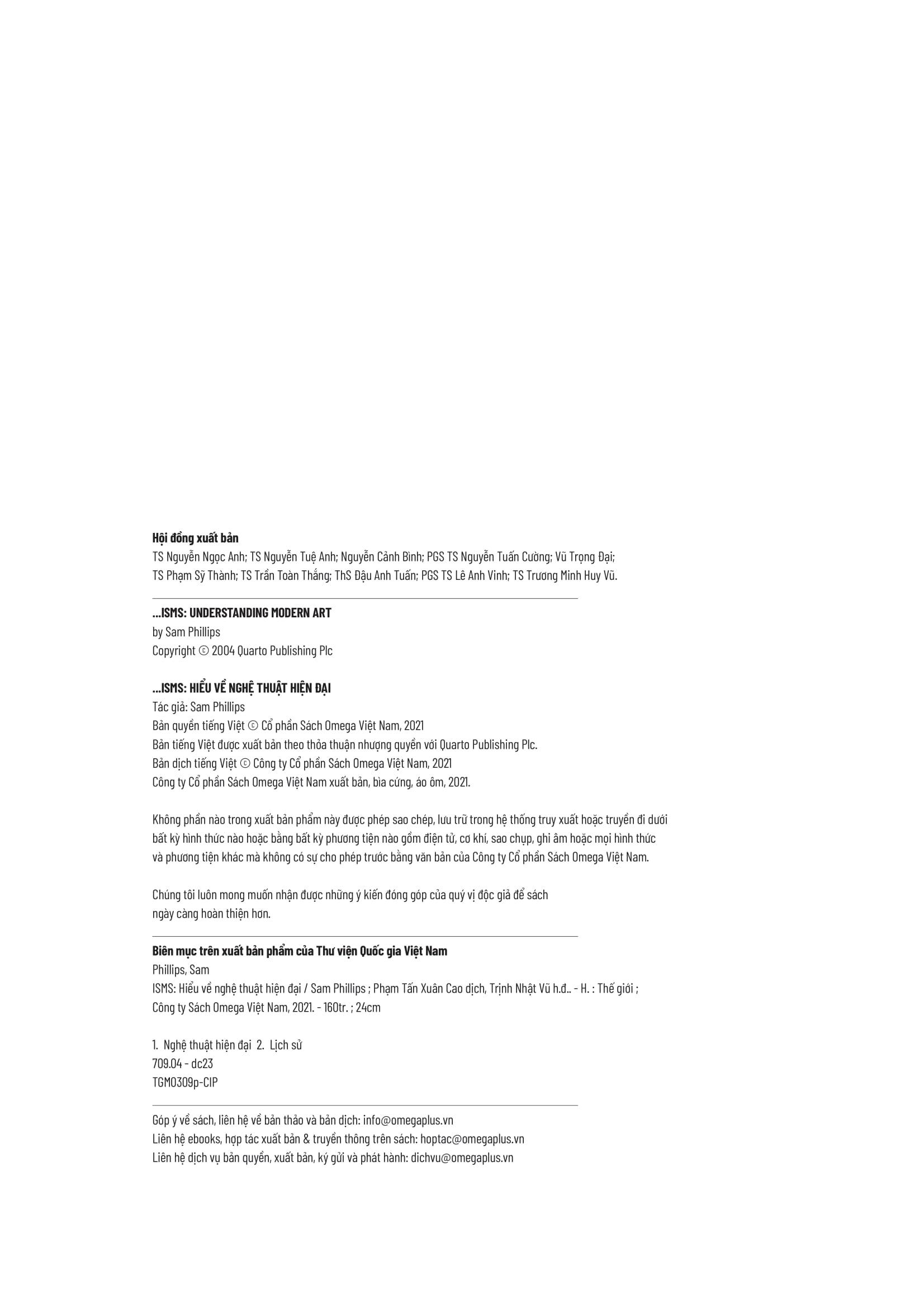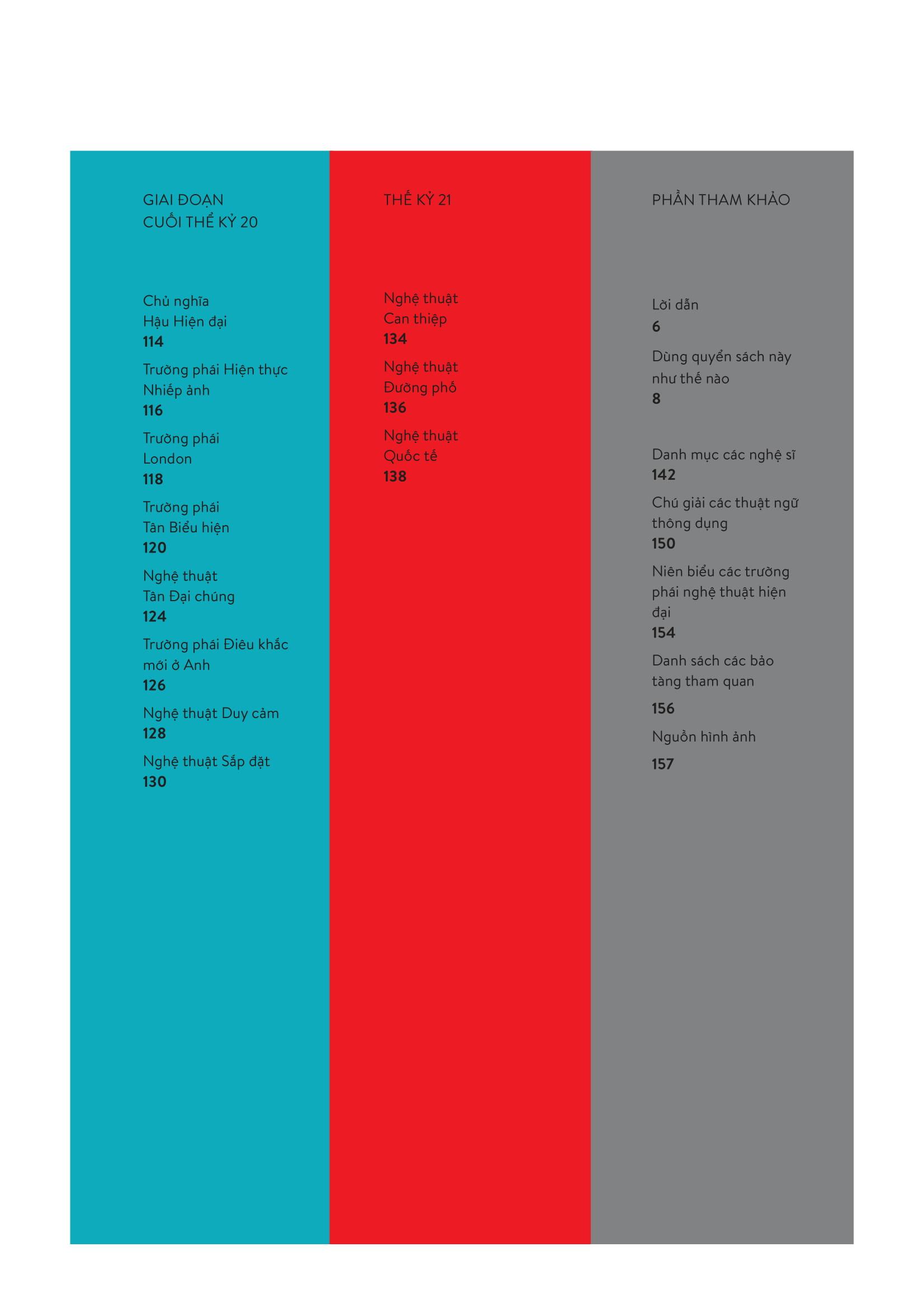 Cuốn sách này là một cẩm nang ngắn gọn giới thiệu cho bạn đọc về 55 trào lưu, trường phái và phong cách thịnh hành từ thời kỳ bình minh hé sáng của nghệ thuật hiện đại cuối thế kỷ 19 cho đến nay, nhằm giúp các bạn làm quen và tiếp cận được một nhánh của dòng chảy lịch sử nghệ thuật.