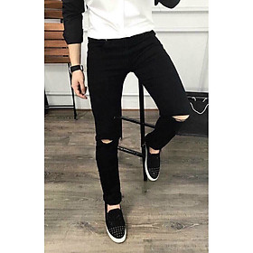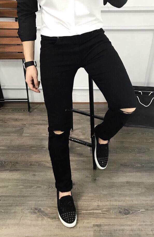 Thiết kế Jean đen rách gối cao cấp phong cách đường may tỉ mỉ.