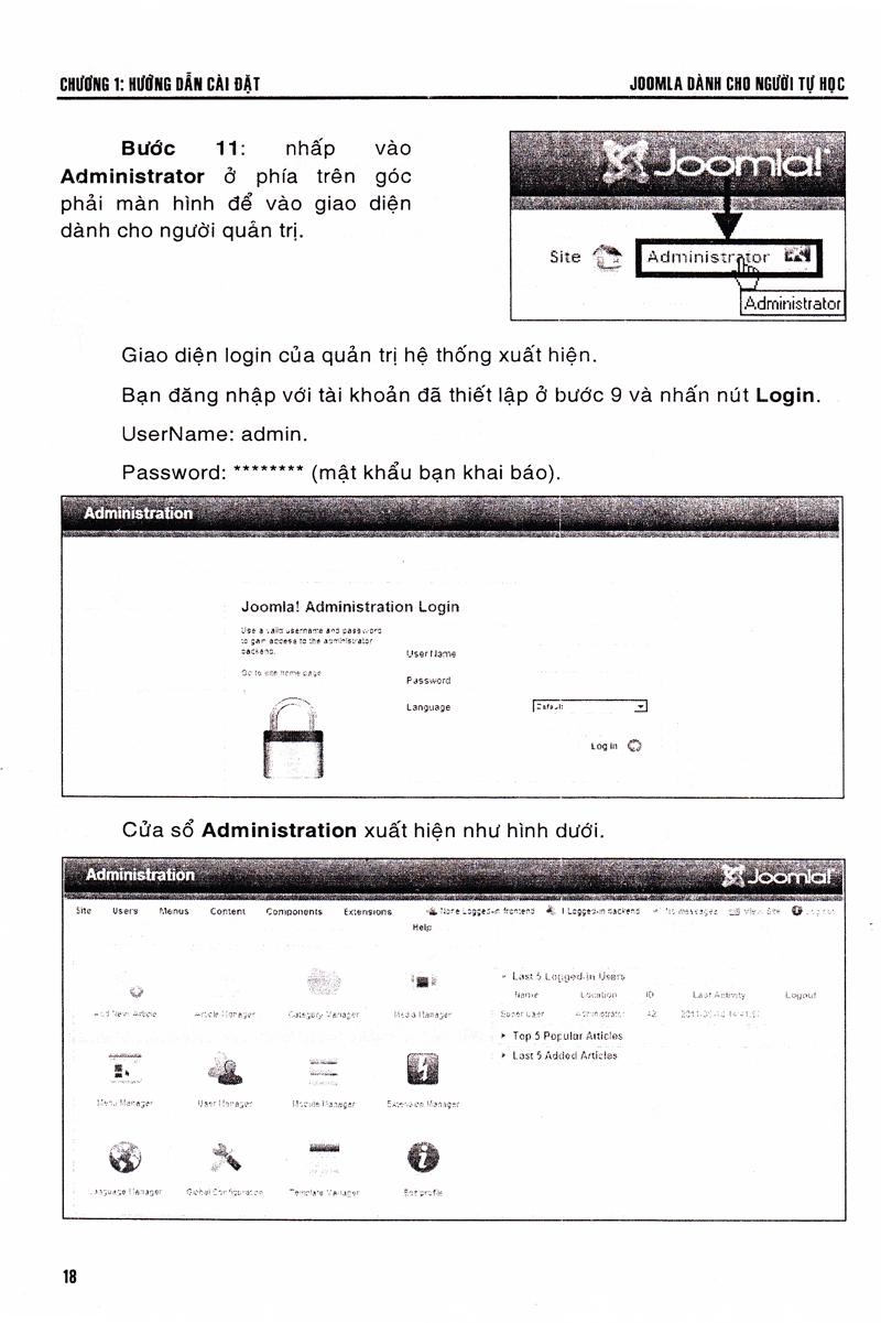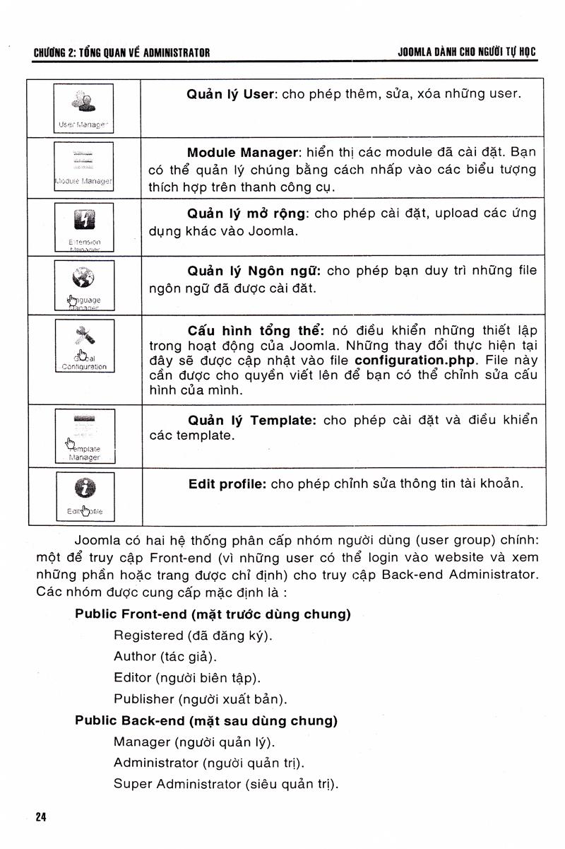 Chương 2: Tổng quan về administrator: Phần quản trị là trung tâm điều khiển của website Joomla. Phần này giúp các bạn biết cách sử dụng giao diện đơn giản, thân thiện của AdminSection để xây dựng cấu trúc và biên tập, xuất nội dung.