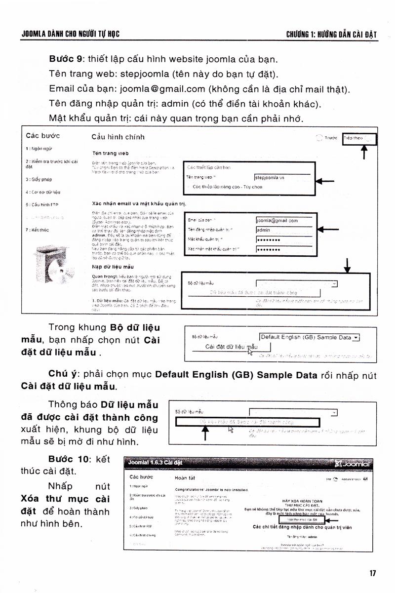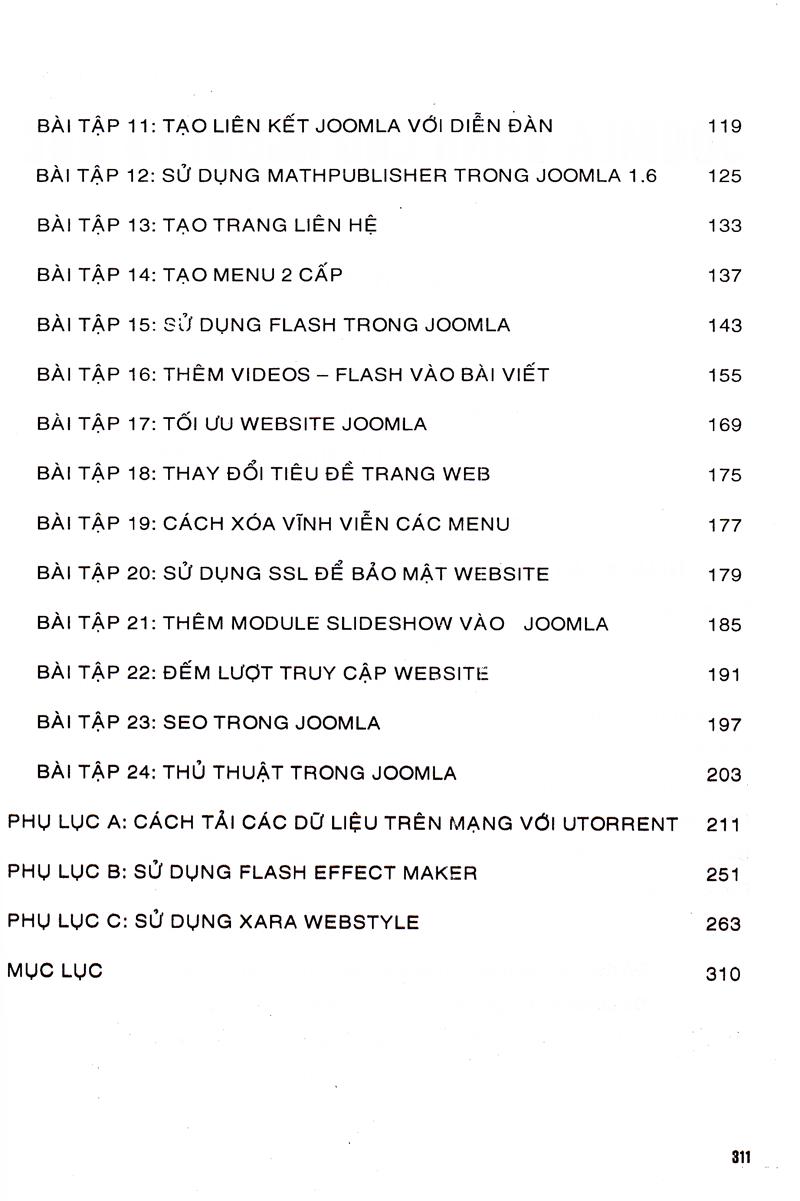 Chương 4: Bài tập thực hành: Đây là phần trọng tâm của sách, bao gồm 24 bài tập với các hướng dẫn từng bước giúp bạn làm quen với Joomla như: tạo bài viết đưa vào menu, đăng bài viết vào danh mục chỉ định, quản lý các bài viết nổi bật, sử dụng module...