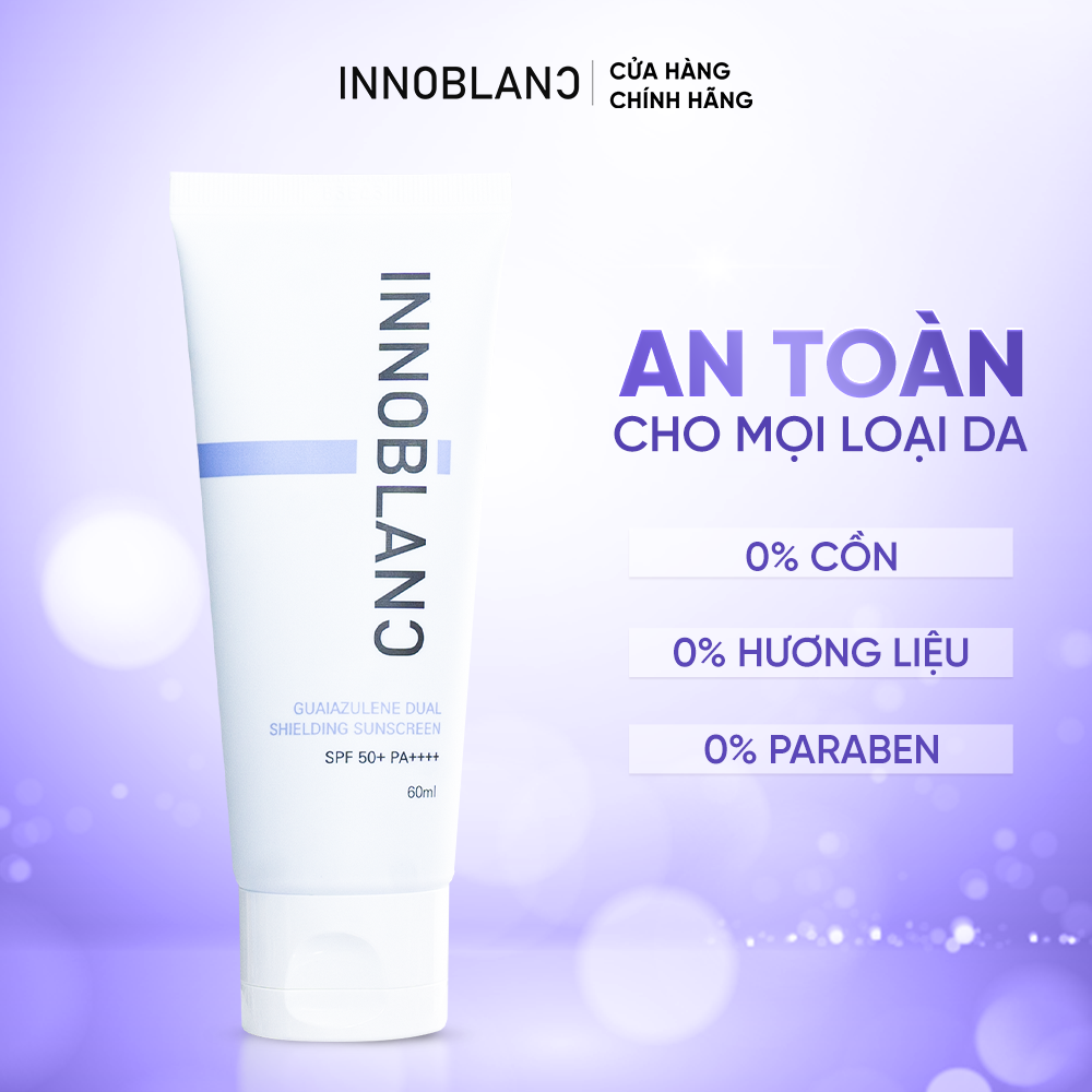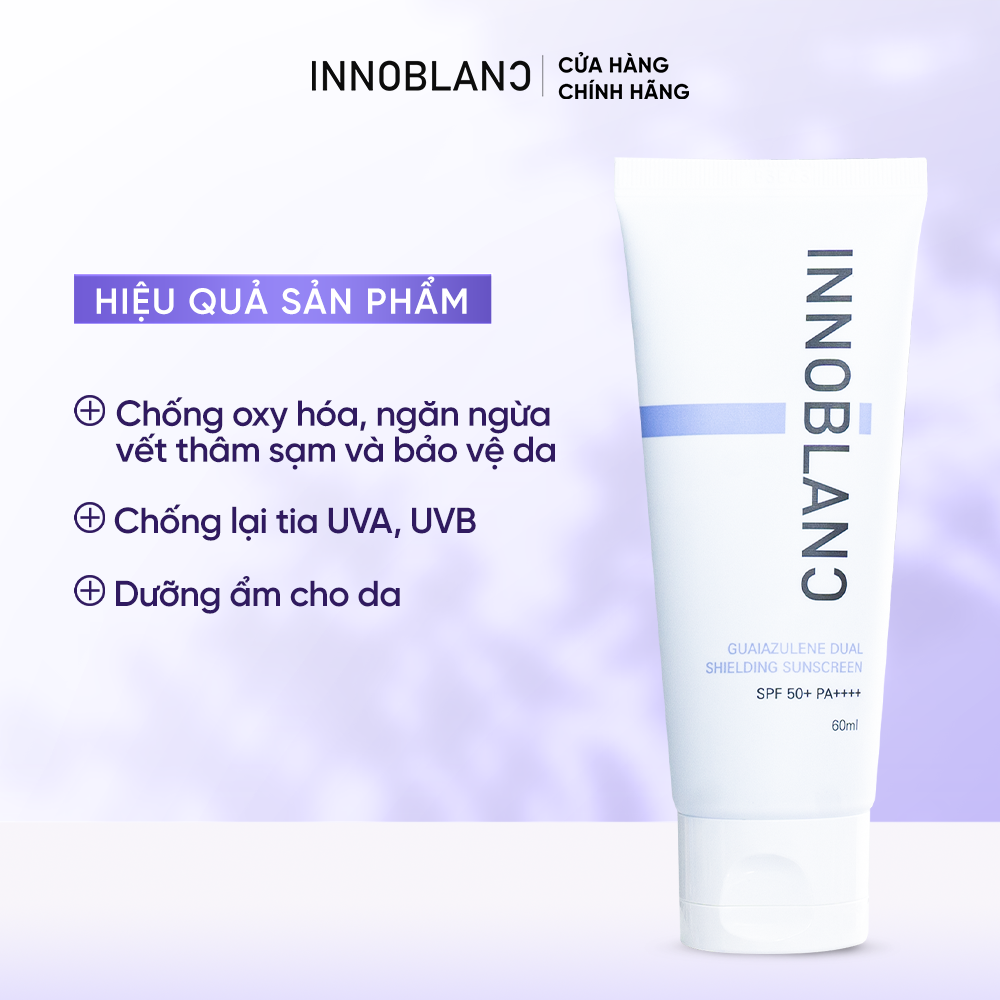 MÔ TẢ SẢN PHẨM: Innoblanc – Guaiazulene Dual Shielding Sunscreen là kem chống nắng kết hợp giữa màng lọc vật lý và hóa học, giúp bảo vệ da toàn diện khỏi tác động của tia UVA & UVB, đồng thời nuôi dưỡng và chăm sóc làn da với chiết xuất thiên nhiên và các hoạt chất dưỡng ẩm, chống oxy hóa. Kết cấu mỏng nhẹ, dễ tán, không để lại vệt trắng hay nhờn rít – phù hợp với khí hậu nóng ẩm và mọi loại da. CÔNG DỤNG: