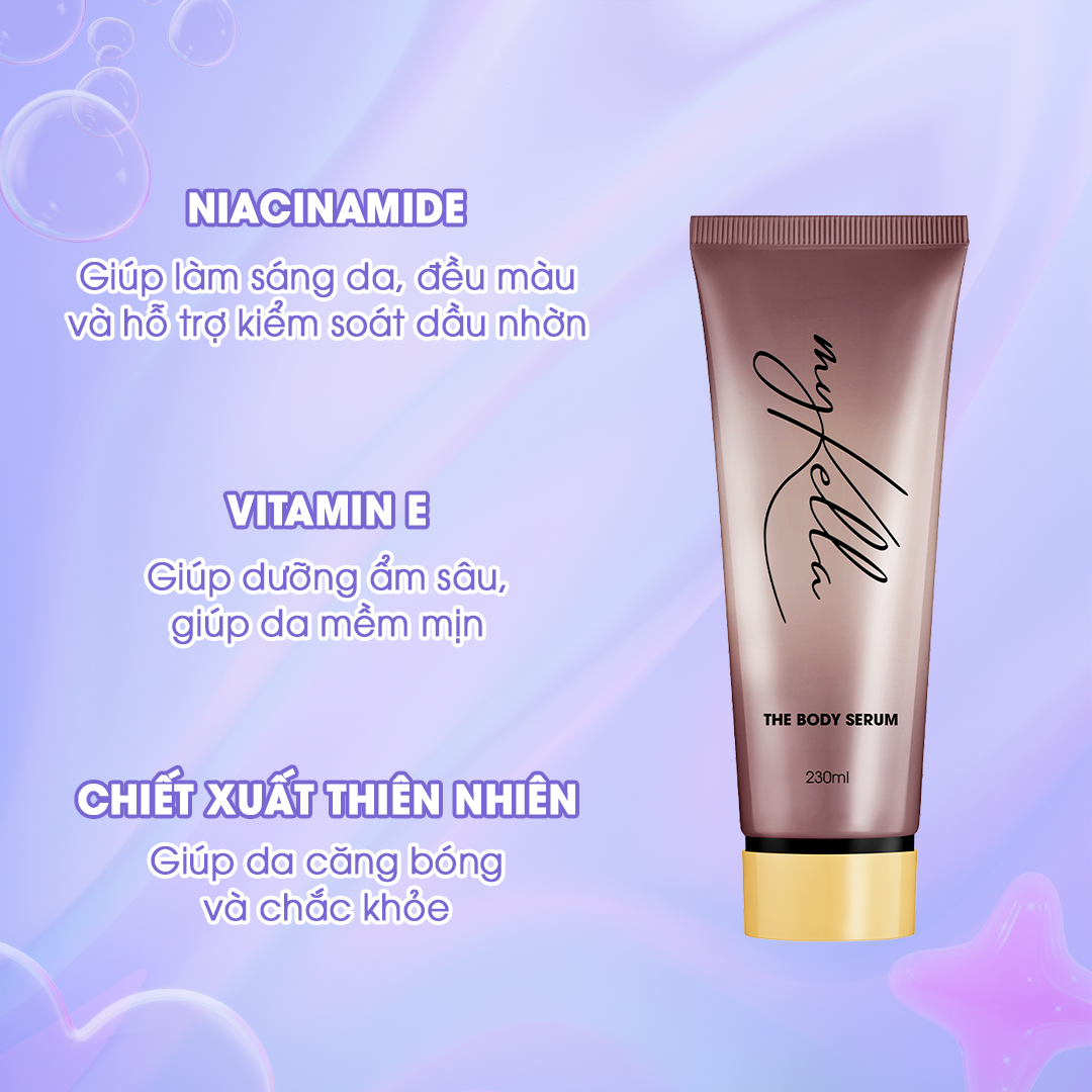 THÔNG TIN SẢN PHẨM Kem dưỡng ẩm The Body Serum myKella là giải pháp giúp làn da trắng mịn, căng bóng và thơm ngát, căng tràn sức sống. Nhờ công thức giàu dưỡng chất với Niacinamide và Vitamin E, sản phẩm giúp tái tạo làn da, làm mờ vết thâm, mang lại vẻ trắng sáng tự nhiên. Đặc biệt, hương thơm nhẹ nhàng, quyến rũ từ thành phần thiên nhiên giúp bạn thư giãn suốt 12 tiếng. THÔNG SỐ KỸ THUẬT