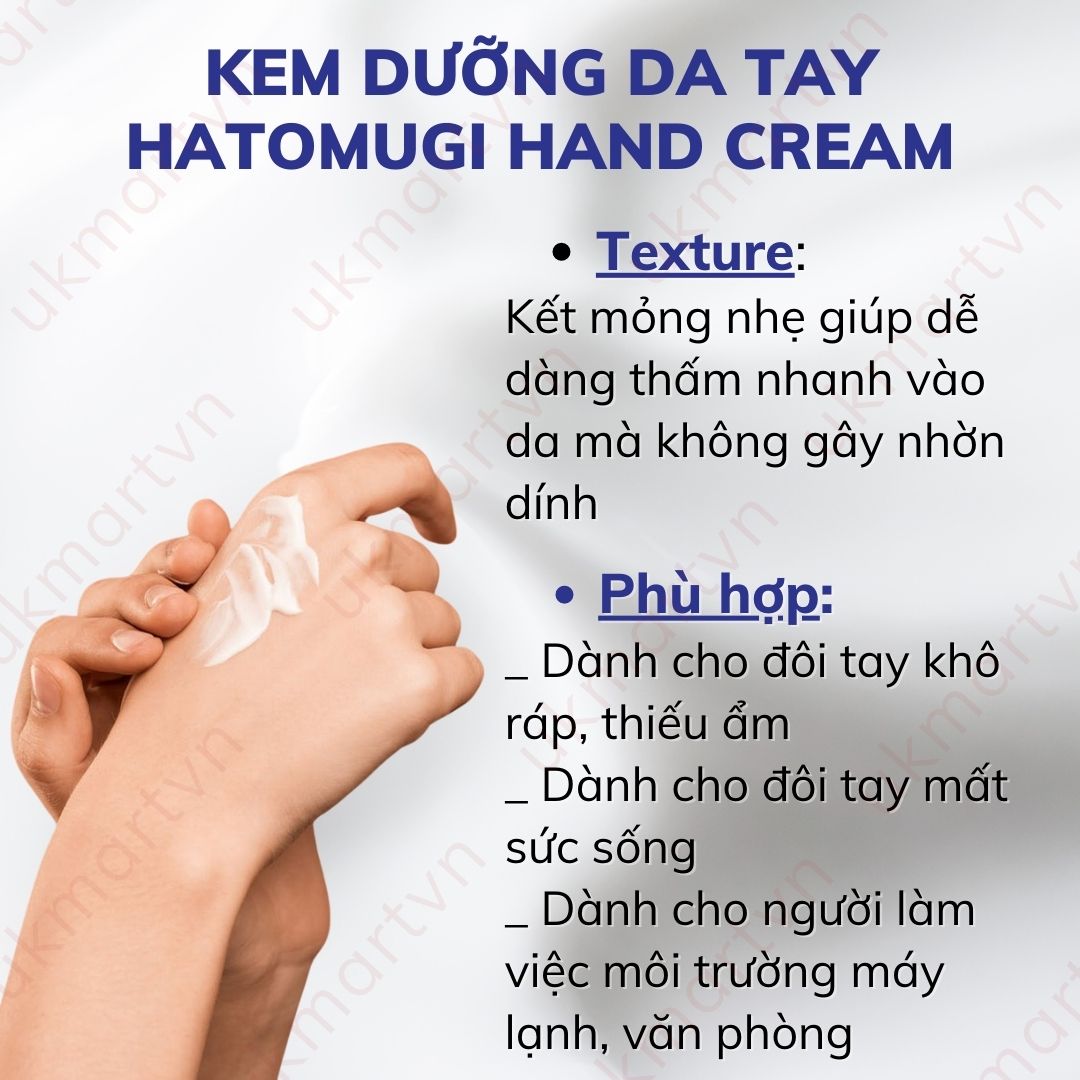 Bên cạnh đó, Kem Dưỡng Tay Hatomugi The Hand Cream với kết cấu chất gel lỏng dạng sữa mềm mượt, thẩm thấu nhanh không gây nhờn rít hay bí lỗ chân lông, sản phẩm có hương thơm dịu mát giúp bạn dễ chịu và thư giãn.