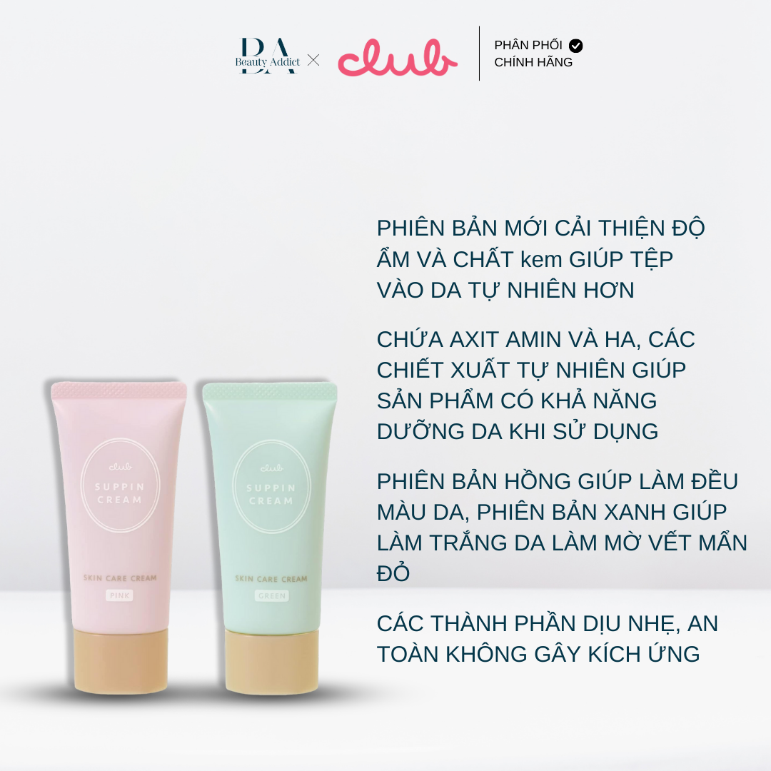 Kem lót chống nắng nâng tone da trắng hồng Club Suppin có công dụng 2 trong 1 khi vừa tạo lớp lót mịn màng, che phủ khuyết điểm, vừa nâng tone da sáng hồng tự