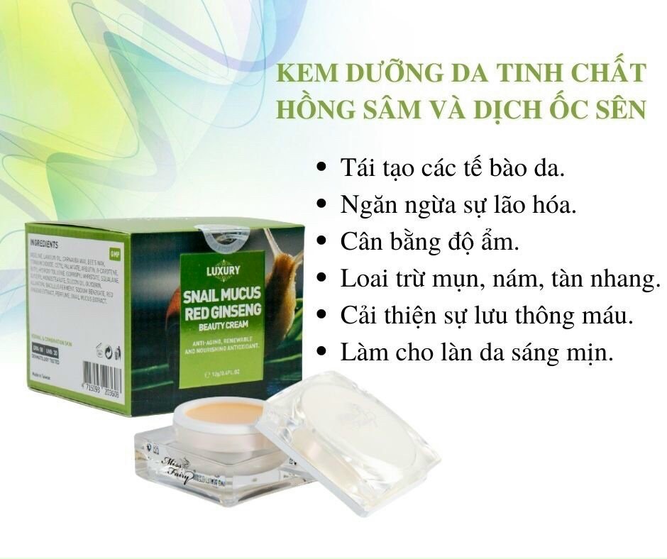 Nếu bạn đang tìm kiếm một loại kem dưỡng có tác dụng ngăn lão hóa và dưỡng ẩm toàn diện cho da tác dụng nhanh chóng và hiệu quả thì kem dưỡng Tinh chất Hồng Sâm và Dịch Ốc sên Miss Fairy là lựa chọn hoàn hảo.