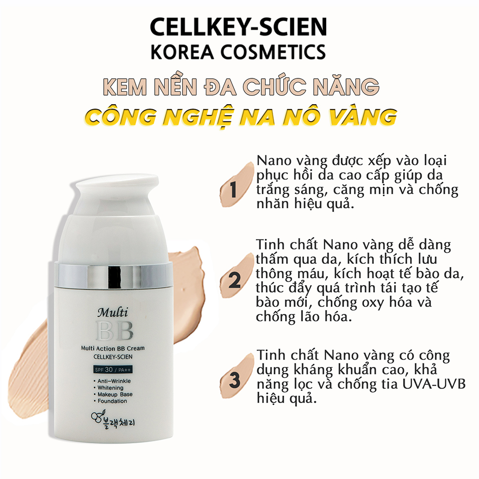Kem Nền Che Khuyết Điểm Kiềm Dầu Chống Nắng Dưỡng Da Ngăn Ngừa Lão Hóa Công nghệ NANO Vàng Cellkey-Scien Multi Action BB Cream với những ưu điểm vượt trội! - Vàng Nano được xếp