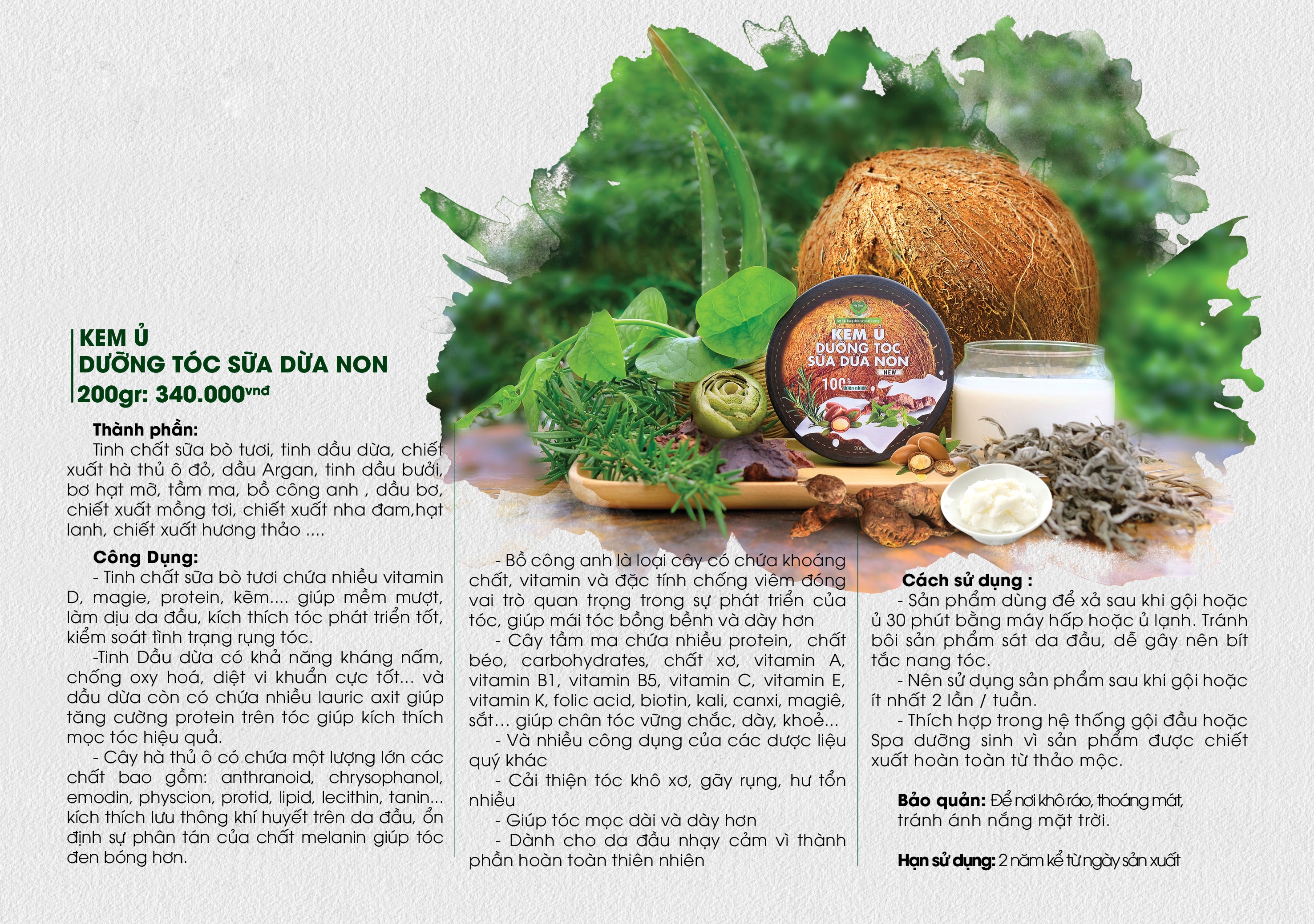 - Tinh chất sữa bò tươi chứa nhiều vitamin D , magie , protein , kẽm giúp tóc mềm mượt , làm dịu da đầu , kích thích tóc phát triển tốt , kiểm soát tình trạng rụng tóc . -Tinh Dầu dừa có khả năng kháng nấm , chống oxy hoá , diệt vi khuẩn cực tốt và dầu dừa còn có chứa nhiều lauric axit giúp tăng cường protein trên tóc giúp kích thích mọc tóc hiệu quả .