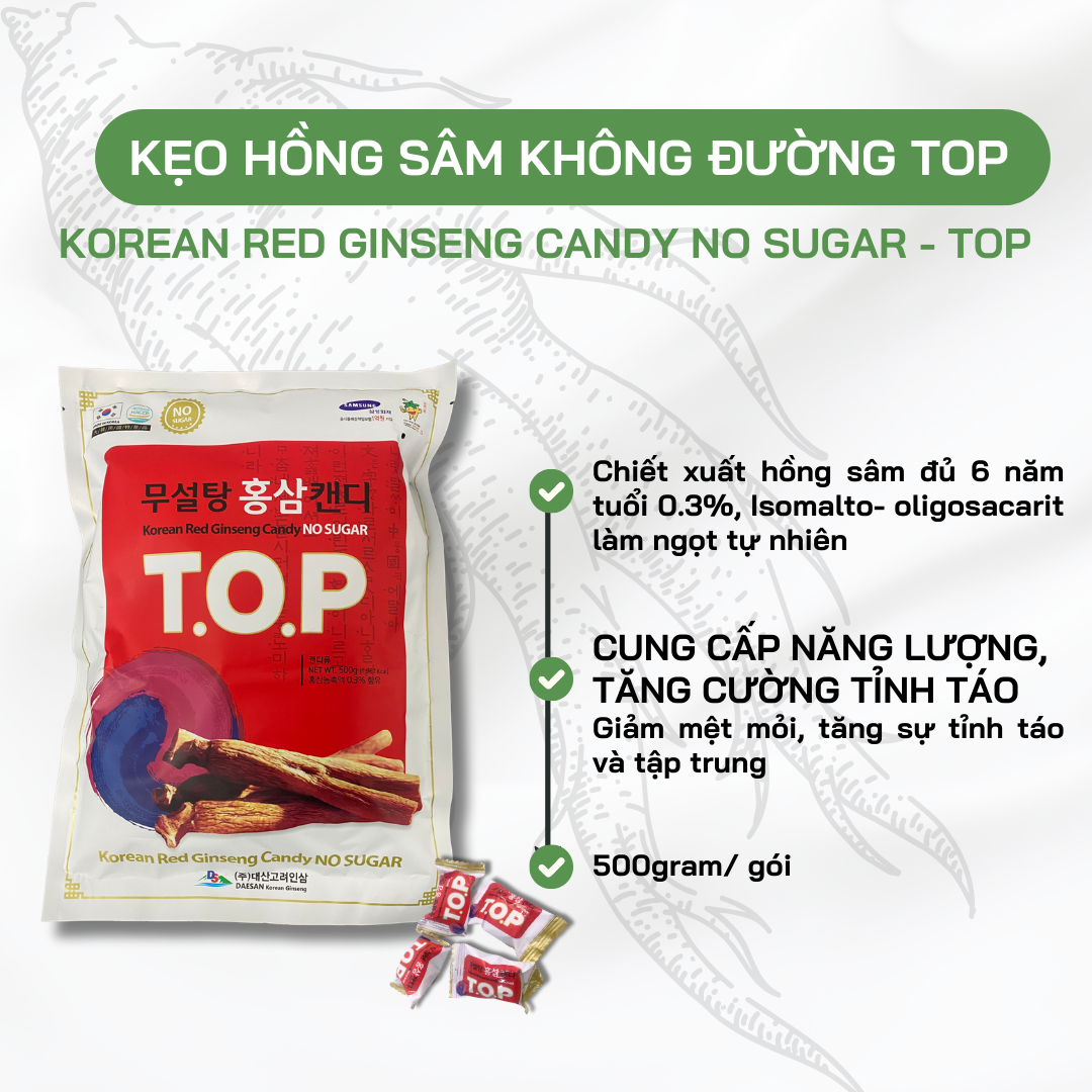 - Đặc biệt dùng phù hợp cho người có bệnh tiểu đường, người dễ say tàu xe. Hướng Dẫn Sử Dụng Kẹo Hồng Sâm Không Đường T.O.P Daesan Hàn Quốc Sante365