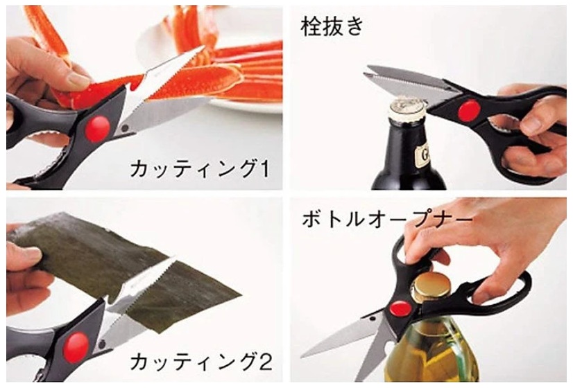 • Với 3 chức năng: dùng để cắt nhiều loại thức ăn như rau, thịt, cá, gà các loại bao bì, túi gói nguyên liệu, sử dụng như dụng cụ khui nắp chai, phần cán kéo dùng để kẹp càng cua ghẹ & các loại hạt, mở nắp chai