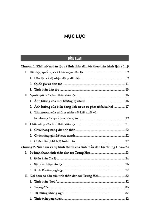 Cuốn sách Khái niệm dân tộc qua tiến trình lịch sử Trung Hoa trình bày và nghiên cứu một cách hệ thống và toàn diện về quan niệm dân tộc trong dòng chảy lịch sử Trung Quốc. Xuất phát từ góc nhìn lịch sử, cuốn sách đã bao quát về tiến trình phát triển và đặc trưng của quan niệm dân tộc từ thời Tiên Tần cho đến thời cận đại. Với những dao động giữa khai phóng và bảo thủ, giữa cởi mở và hẹp hòi, giữa bao dung hài hoà và bài xích cực đoan, cuốn sách đã chỉ ra mối liên hệ khăng khít giữa tinh thần dân tộc và tình hình văn hoá, chính trị, xã hội của các giai đoạn lịch sử.