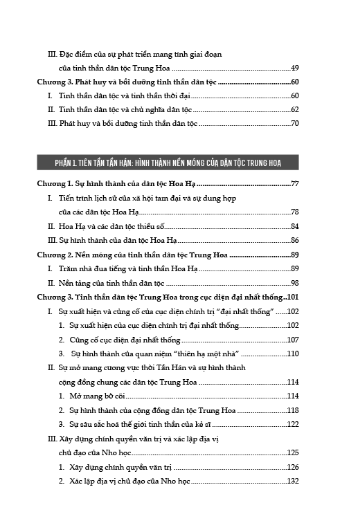 Cuốn sách là công trình nghiên cứu chi tiết về quá trình hình thành khái niệm dân tộc, sự thay đổi trong ngoại diên và nội hàm của khái niệm dân tộc trong tiến trình lịch sử Trung Hoa từ thời Tiên Tần đến cận đại, cùng đặc trưng của nó trong mỗi giai đoạn lịch sử đặc thù, trong đó nhấn mạnh: