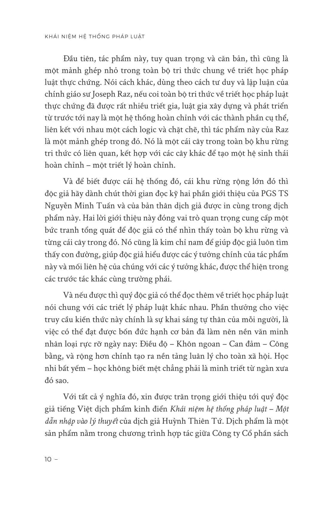 “Cuốn sách này có ý nghĩa quan trọng đến mức nhiều nhà nghiên cứu pháp lý còn cho rằng thông qua nó “Joseph Raz đã mở ra cánh cửa để bước vào chủ nghĩa thực chứng pháp lý (posivitism)”. Quả đúng như vậy. Có lẽ đây là cuốn sách mở ra một cách tiếp cận mà tôi cho là đầy đủ, toàn diện, hệ thống và sâu sắc nhất hiện nay về chủ nghĩa thực chứng pháp lý cũng như về khái niệm hệ thống pháp luật.”