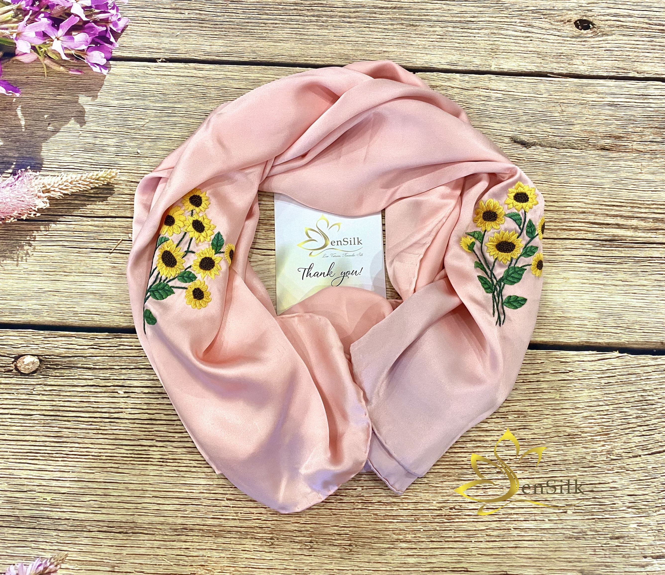 Khăn Lụa Thêu Hoa Hướng Dương SenSilk loài hoa tình yêu luôn hướng về phía mặt trời nên thường là biểu tượng của lòng trung thành, chung thủy sâu sắc, sự kiên định đó cũng biểu thị cho sức mạnh, uy quyền, sự ấm áp…