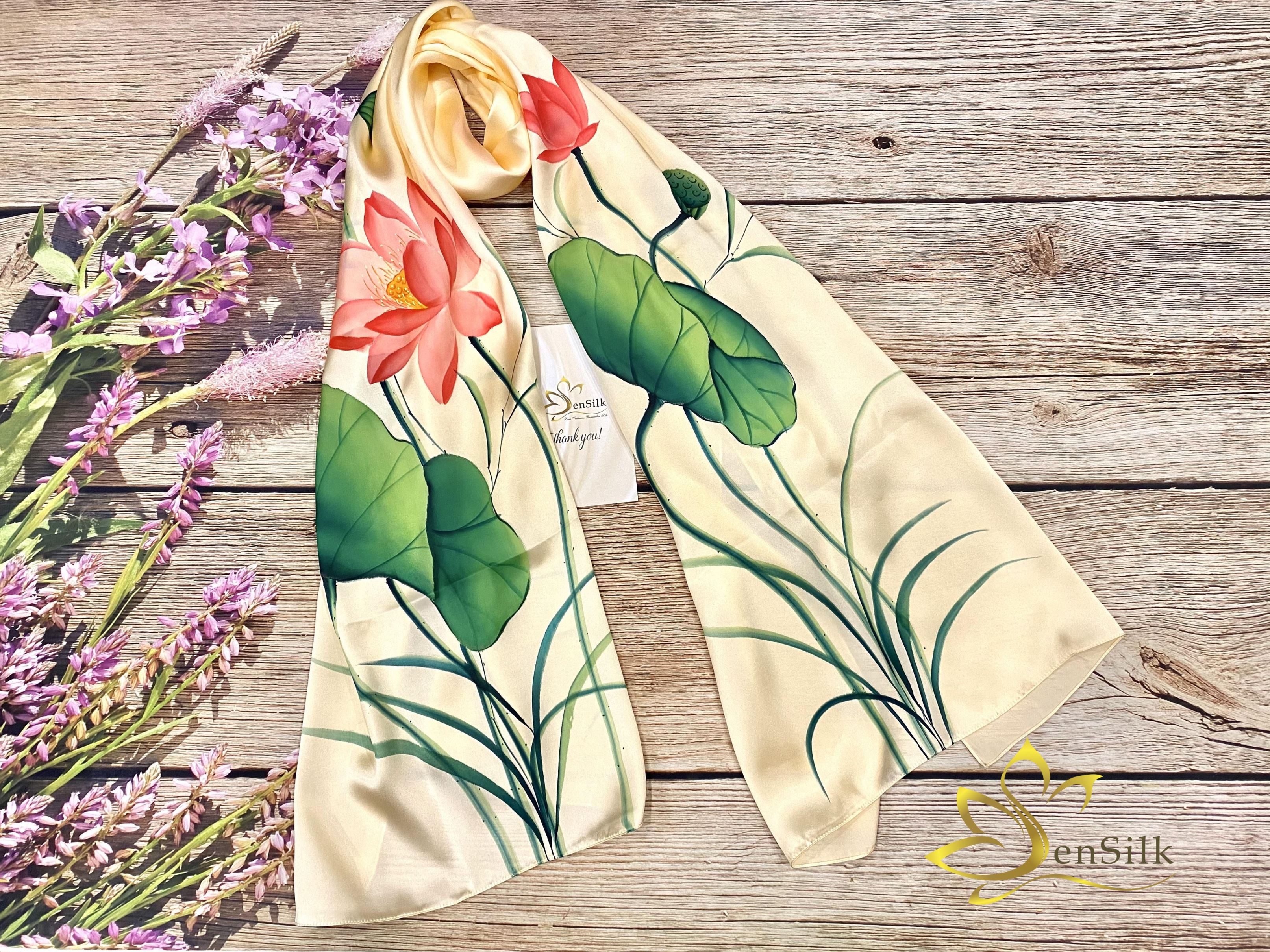 ✨Khăn Lụa Vẽ Tay SenSilk Limited - Mẫu Hoa Sen (Nude - Hồng - Xanh), Quà Tặng Đẳng Cấp Silk Painting 180x55cm, Lụa Tơ Tằm Bảo Lộc Cao Cấp