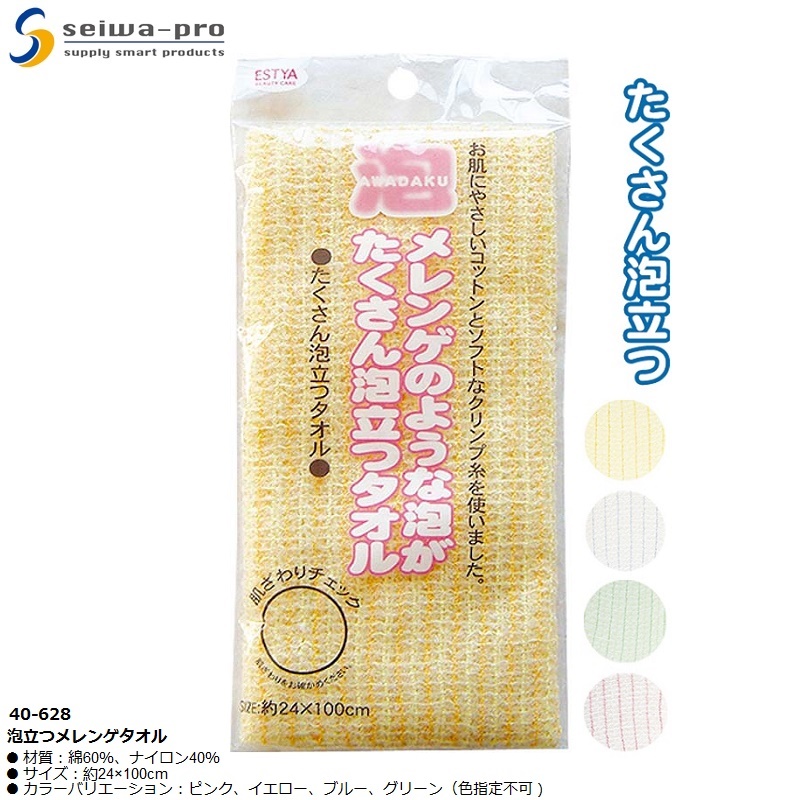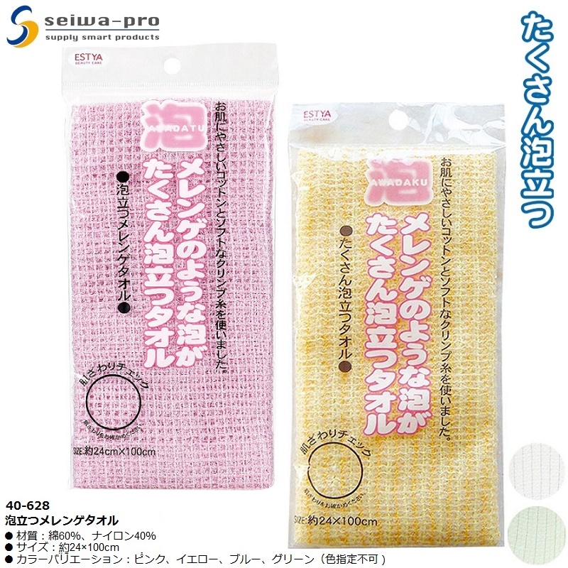 Mua tại TiktokKhăn tắm tạo bọt Seiwa-pro meringue 24x100cm ■ Xuất xứ: Nhật Bản | MADE IN JAPAN ■ NSX: Seiwa-Pro Co., Ltd (Japan) ■ Model: 40-628 ■ Kích thước: 255×125×15mm ■ Màu sắc: Màu vàng | Màu xám | Màu xanh ( Giao ngẫu nhiên) ■ Chất liệu: