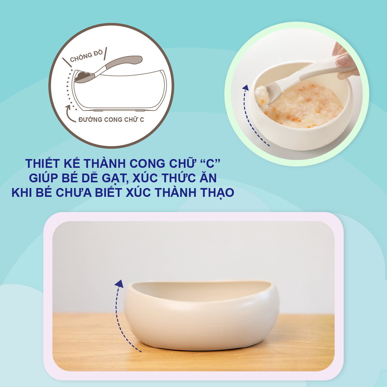 Chén và khay ăn dặm được thiết kế thông minh với thành cong chữ "C", giúp bé dễ dàng gạt thức ăn vào muỗng, hỗ trợ khi bé chưa thành thạo kỹ năng tự xúc. Đường cong nhẹ nhàng và thành bát cao vừa phải, hạn chế thức ăn bị đổ ra ngoài.