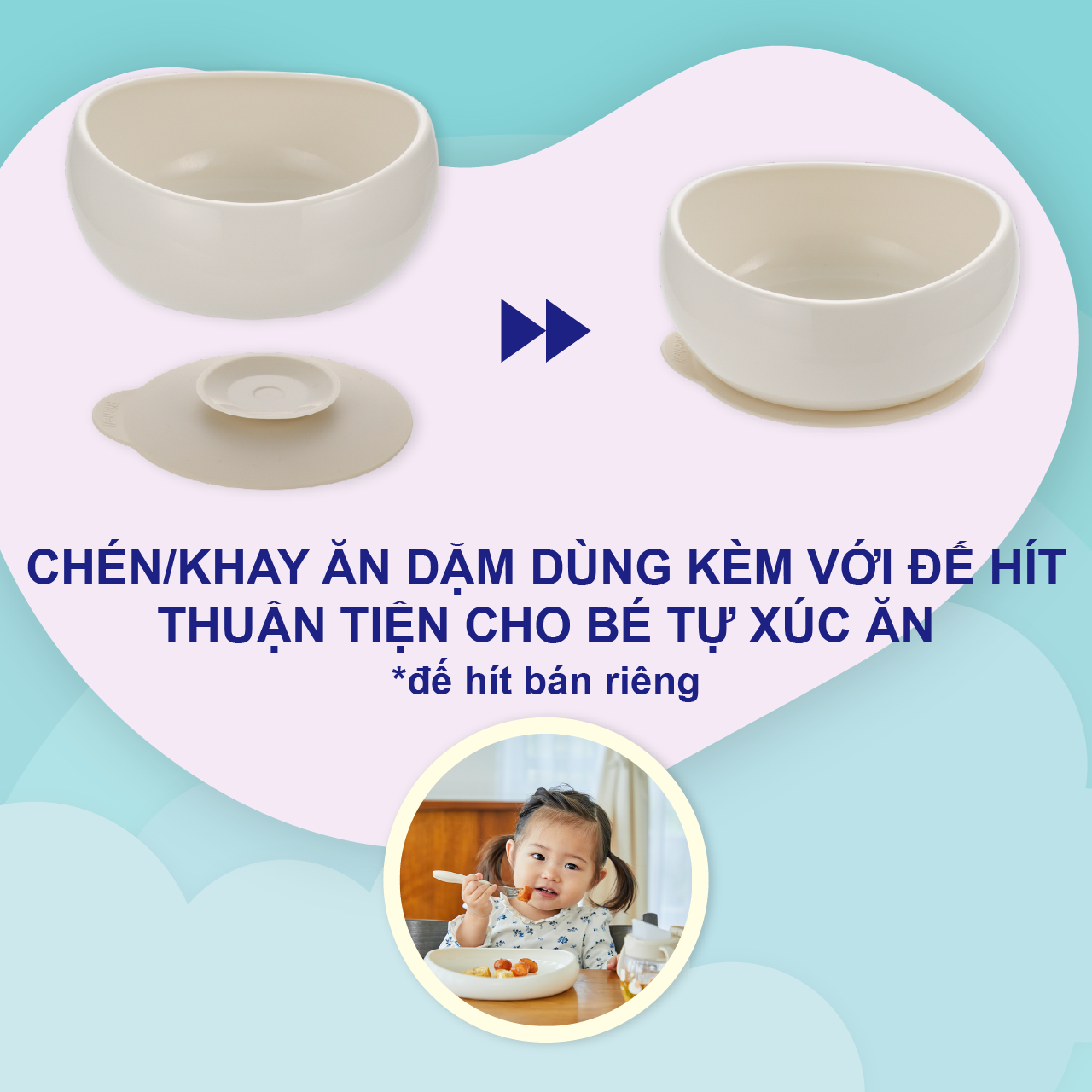 Khi kết hợp cùng đế hít chuyên dụng, chén và khay sẽ bám chặt vào mặt bàn, giúp bé thoải mái tự xúc ăn mà không làm đổ ngã. Phù hợp cho bé trong giai đoạn tập tự lập khi ăn uống.