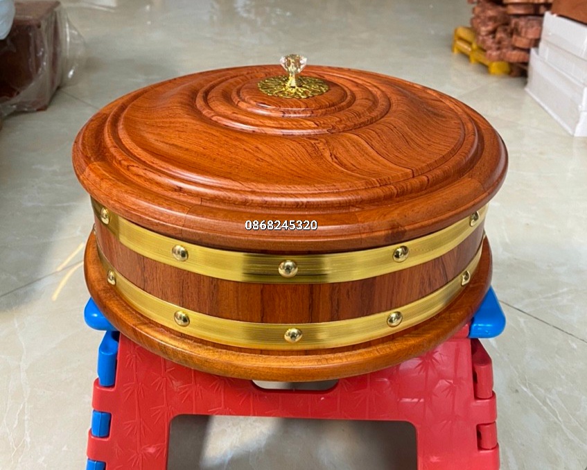Khay Đựng Bánh MỨT Kẹo Gỗ Hương Kích thước: cao 9cm, đường kính 31cm tính từ góp chóp này sang góc chóp kia Chất liệu: Gỗ hương đỏ cao cấp Xuất xứ: được