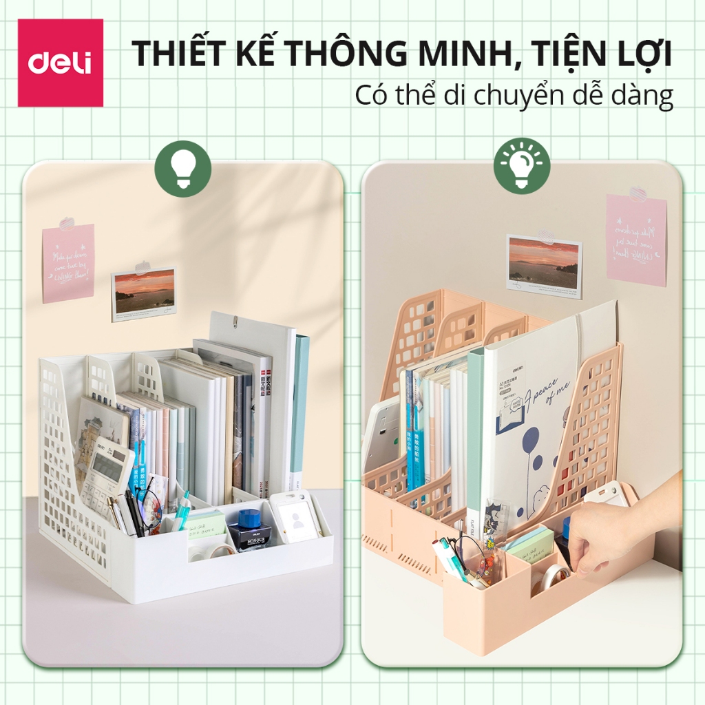 TÍNH NĂNG SẢN PHẨM ️Chất liệu nhựa PP chắc chắn, siêu bền, đảm bảo lưu trữ tài liệu ️Dễ dàng sử dụng, lưu trữ tài liệu ️Thiết kế mở, tránh bụi, nhiều lỗ nhỏ giúp đứng vững hơn ️Thiết kế với đa mục đích, có thể sử dụng đỡ giá sách, cắm bút và đồ dùng học tập THÔNG TIN SẢN PHẨM: Tên sản phẩm: Set giá tài liệu 4 ngăn kèm ống bút Deli Mã sản phẩm: PB106 Màu sắc: Xanh lá/ Hồng/ Trắng Xuất xứ: Trung Quốc
