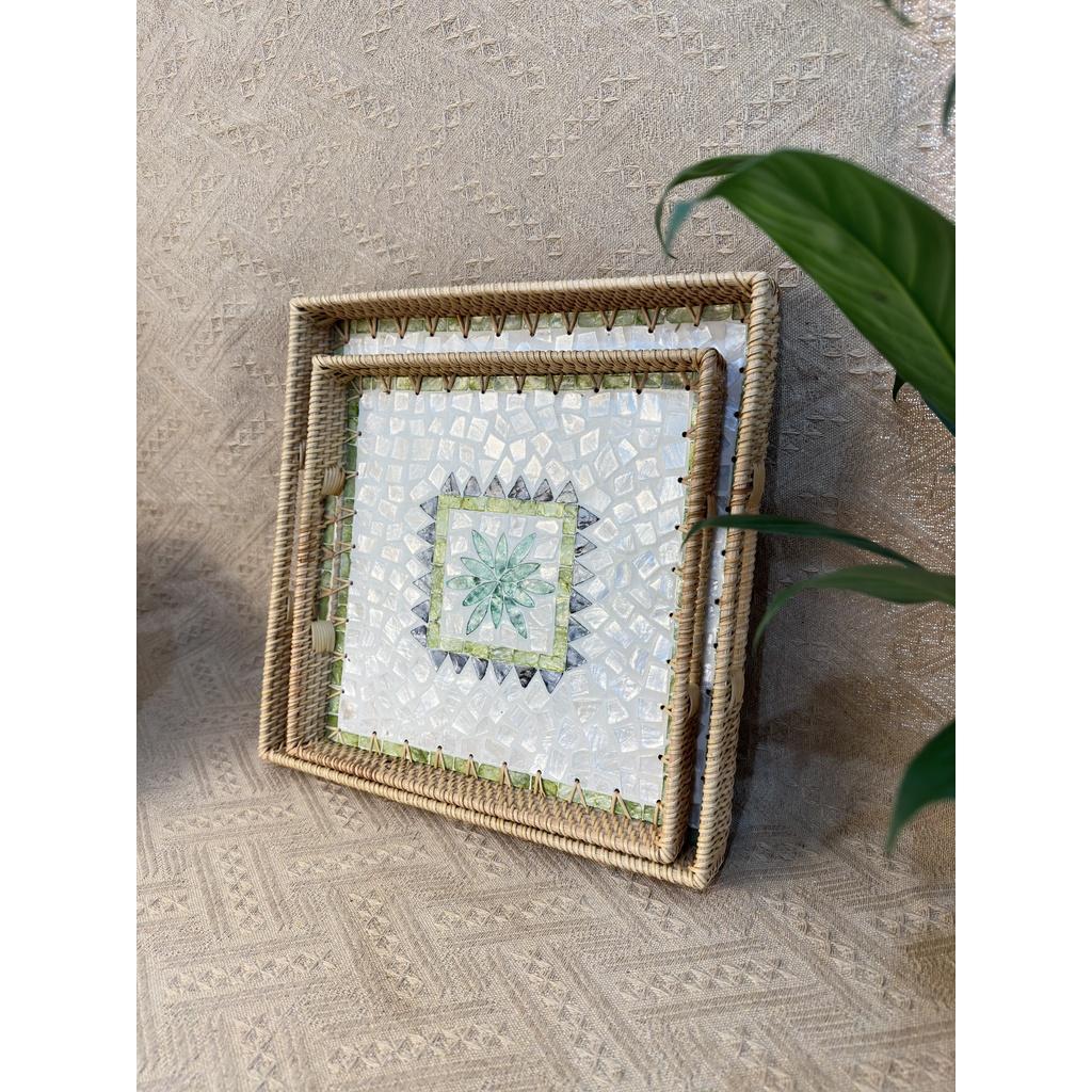 Khay mây khảm trai hình vuông ONGTRE có tay cầm đựng hoa quả, decor dùng cho nhà hàng khách sạn resort