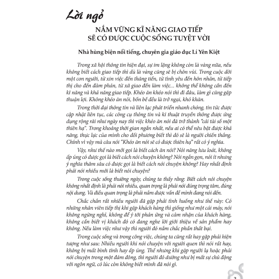 Trong xã hội thông tin hiện đại, sự im lặng không còn là vàng nữa, nếu không biết cách giao tiếp thì dù là vàng cũng sẽ bị chôn vùi. Trong cuộc đời một con người, từ xin việc đến thăng tiến, từ tình yêu đến hôn nhân, từ tiếp thị cho đến đàm phán, từ xã giao đến làm việc… không thể không cần đến kĩ năng và khả năng giao tiếp. Khéo ăn khéo nói thì đi đâu, làm gì cũng gặp thuận lợi. Không khéo ăn nói, bốn bề đều là trở ngại khó khăn.