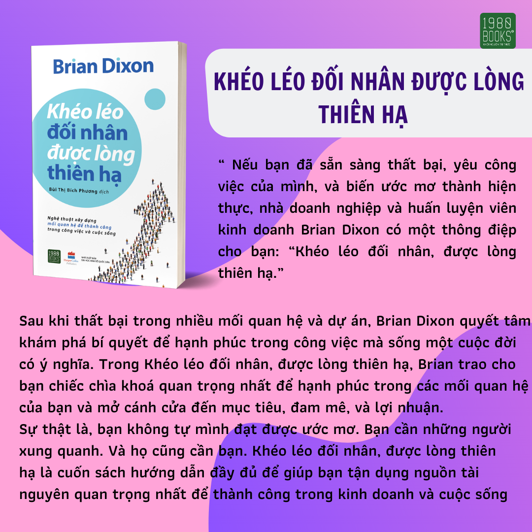 Sau khi thất bại trong nhiều mối quan hệ và dự án, Brian Dixon quyết tâm khám phá bí quyết để hạnh phúc trong công việc mà sống một cuộc đời có ý nghĩa. Trong Khéo léo đối nhân, được lòng thiên hạ, Brian trao cho bạn chiếc chìa khoá quan trọng nhất để hạnh phúc trong các mối quan hệ của bạn và mở cánh cửa đến mục tiêu, đam mê, và lợi nhuận.