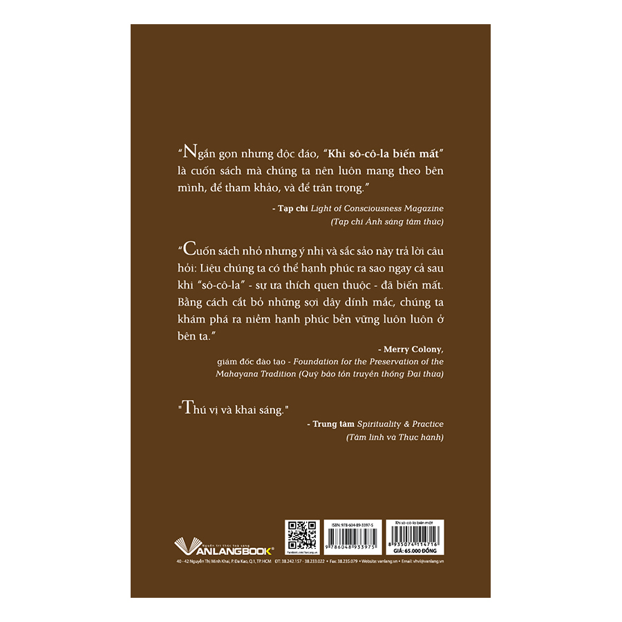 Khi Sô Cô La Biến Mất “Ngắn gọn nhưng độc đáo, “Khi sô-cô-la biến mất” là cuốn sách mà chúng ta nên luôn mang theo bên mình, để tham khảo, và để trân trọng.” - Tạp chí Light of Consciousness Magazine (Tạp chí Ánh sáng tâm thức) “Cuốn sách Khi sô cô la biến mất nhỏ nhưng ý nhị và sắc sảo này trả lời câu hỏi: Liệu chúng ta có thể hạnh phúc ra sao ngay cả sau khi “sô-cô-la” - sự ưa thích quen thuộc - đã biến mất. Bằng cách cắt bỏ những sợi dây dính mắc, chúng ta khám phá ra niềm hạnh phúc bền vững luôn luôn ở bên ta.” - Merry Colony, Giám đốc đào tạo - Foundation for the Preservation of the Mahayana Tradition (Quỹ bảo tồn truyền thống Đại thừa) "Thú vị và khai sáng." - Trung tâm Spirituality & Practice