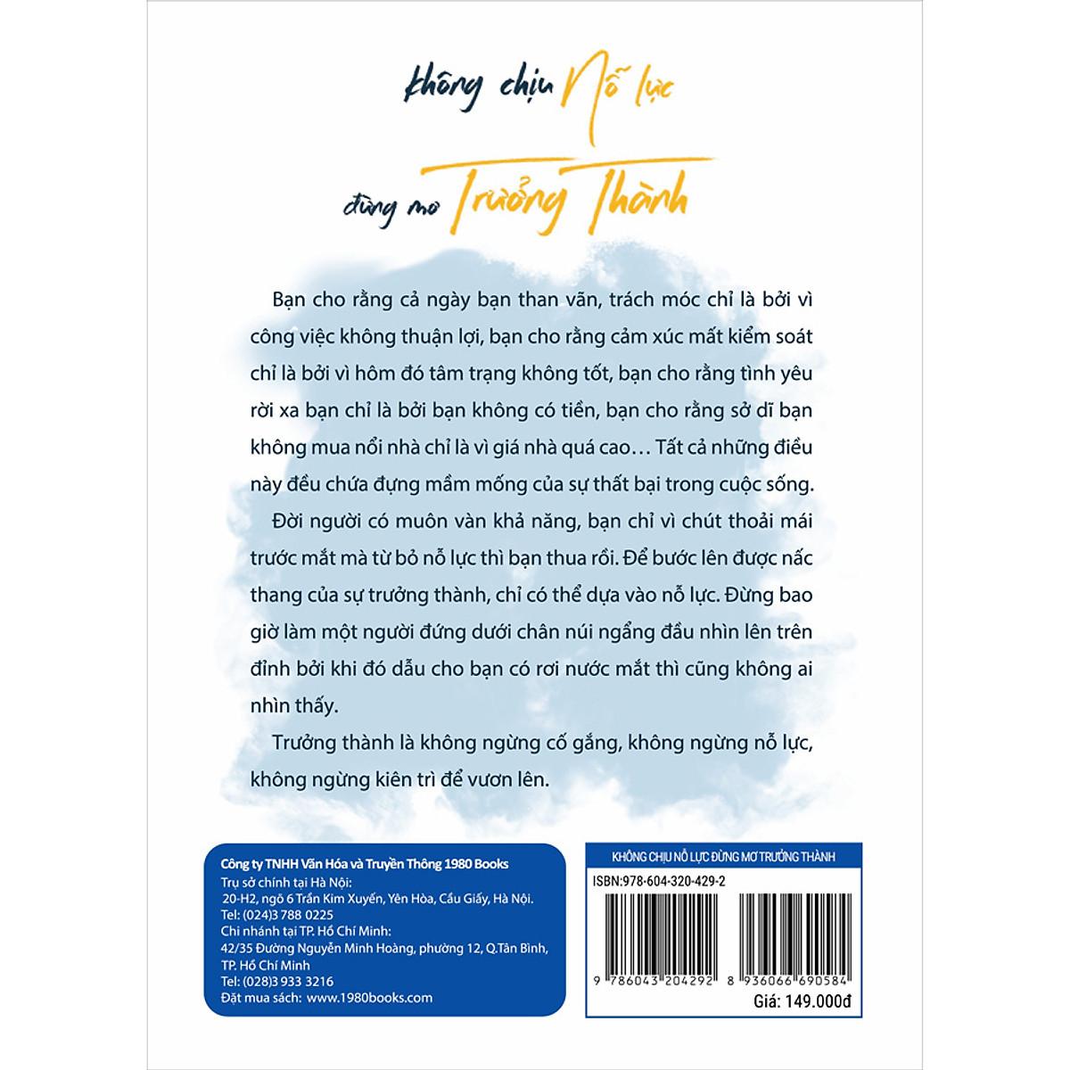 Mua tại TiktokMỗi người đều có một cái “kén” trói buộc mình, trước khi phá kén, đều sống cuộc đời giống như con sâu vậy. Cái kén này có thể là gia cảnh nghèo khó, là cuộc sống đơn điệu mỗi ngày, là những tiếng cãi lộn không điểm dừng của bố mẹ, là cuộc hôn nhân thất bại, là công việc không chút khởi sắc, là căn nhà có thể mãi mãi cũng không mua nổ Trong chiếc kén như thế này, nếu như chúng ta ngủ nướng, có thể chúng ta không hề cảm thấy khó chịu là bao, nhưng một khi chúng ta bắt đầu suy nghĩ thì sẽ lập tức cảm nhận được sự đau khổ khi bị trói buộc. Nó vây hãm chúng ta, khiến chúng ta không thể cử động, vì thế trong cuộc sống có vô số lần chúng ta rơi vào bế tắc, chỉ biết thở dài mà không biết tương lai rồi sẽ ra sao. Làm thế nào chúng ta mới có thể phá kén mà giương cánh bay cao, thật sự trải nghiệm được cảm giác tự do bay lượn giữa đất trời bao la? Không chịu nỗ lực đừng mơ trưởng thành sẽ giúp bạn giải đáp câu hỏi ấy. Chúng ta cần phải khắc phục ảnh hưởng của ngoại cảnh, khắc phục sự do dự, lười biếng, băn khoăn và lo lắng. Bất kể thế giới bên ngoài có biến hóa như thế nào, người có tinh thần tự thúc đẩy, cuối cùng đều sẽ nghe theo trái tim mình, cho dù đối mặt với tình trạng biến hóa nhanh chóng thế nào đi chăng nữa, rơi vào hoàn cảnh khó khăn như thế nào chăng nữa, cũng sẽ âm thầm chịu đựng, một mình tiến về phía trước. Đời người có muôn vàn khả năng, bạn chỉ vì chút thoải mái trước mắt mà từ bỏ nỗ lực thì bạn thua rồi. Để bước lên được nấc thang của sự trưởng thành, chỉ có thể dựa vào nỗ lực. Đừng bao giờ làm một người đứng dưới chân núi ngẩng đầu nhìn lên trên đỉnh bởi khi đó dẫu cho bạn có rơi nước mắt thì cũng không ai nhìn thấy. Trưởng thành là không ngừng cố gắng, không ngừng nỗ lực, không ngừng kiên trì để vươn lên. Thông tin tác giả: Lý Hủ Nhiên là VVIP trên diễn đàn Zhihu, có hàng triệu fan hâm mộ. Tài khoản cá nhân “Hủ tiên sinh” được Notesandbox và Newrank đánh giá là “một trong mười tài khoản Wechat đáng giá nhất” trong lĩnh vực kỹ năng nơi công sở. Sáng tác rất nhiều tác phẩm hot có danh tiếng tốt, được chia sẻ trên tường của các tài khoản lớn như Nhật báo Nhân dân, Youshu, Duzhe, Master I