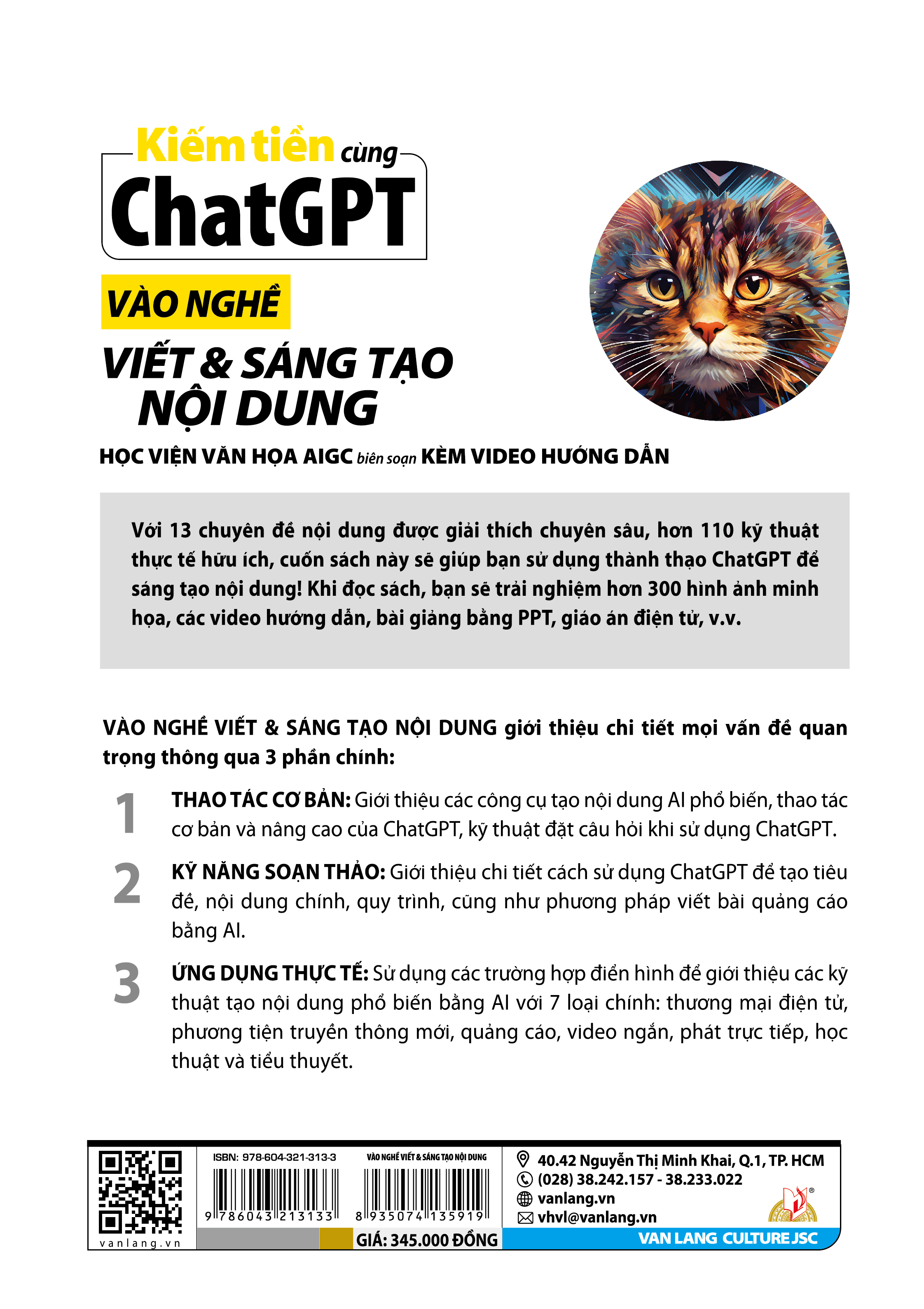 "Với 13 chuyên đề nội dung được giải thích chuyên sâu, hơn 110 kỹ thuật thực tế hữu ích, cuốn sách này sẽ giúp bạn sử dụng thành thạo ChatGPT để sáng tạo nội dung! Khi đọc sách, bạn sẽ trải nghiệm hơn 300 hình ảnh minh họa, các video hướng dẫn, bài giảng bằng PPT, giáo án điện tử, v.v.