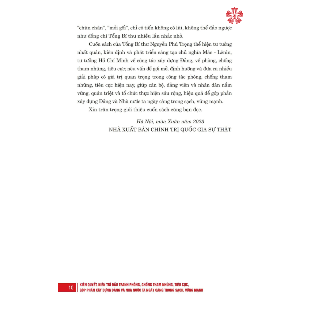 Phần thứ nhất có tiêu đề: “Một số vấn đề rút ra từ thực tiễn công cuộc đấu tranh phòng, chống tham nhũng, tiêu cực ở Việt Nam”, gồm bài viết tổng quan; 4 bài phát biểu kết luận tại các Hội nghị toàn quốc về công tác phòng, chống tham nhũng, tiêu cực các năm 2014, 2018, 2020, 2022 và trích kết luận chỉ đạo của đồng chí Tổng Bí thư Nguyễn Phú Trọng, Trưởng Ban Chỉ đạo Trung ương về phòng, chống tham nhũng, tiêu cực tại 36 phiên họp, cuộc họp của Ban Chỉ đạo, Thường trực Ban Chỉ đạo từ năm 2013 đến năm 2022.
