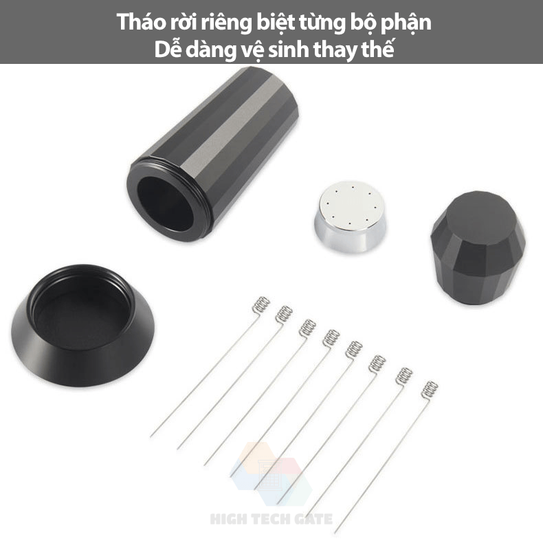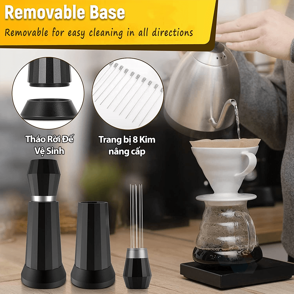 Kim đánh tơi bột cà phê WDT Một dụng cụ giúp ích cho việc pha chế các Espresso tuyệt vời, đạt chuẩn chất lượng nhanh chóng. Chống channeling Khi pha chế bằng máy pha cà phê Espresso, thông thường cà phê khi xay ra mịn sẽ làm vón cục, dẫn tới quá trình nén và chiết xuất họng pha sẽ không đồng đều, không đủ áp, xuất hiện hiện tượng channeling khi pha. Kim đánh tơi bột cà phê WDT sẽ rất hữu ích giúp cho việc phân bổ đồng đều cà phê bột bên trong, chống bị bón cục. Với thiết kế tám khi khuấy, là phiên bản nâng cấp của các WDT trước đây, giúp người dùng đánh tơi dễ hơn, và giảm thiểu thời gian đơn giản hơn. Sở hữu đường kính kim chỉ còn 0.4mm với chất liệu SS304 bền bỉ. Phiên bản cũ đã bị đánh bại hoàn toàn với đường kính này. Thiết kế có thể tháo rời toàn bộ các bộ phận riêng biệt. Vệ sinh Kim đánh tơi bột cà phê WDT dễ dàng mà đơn giản. Đặc biệt là phần Đế, giúp việc làm sạch bột cà phê lâu ngày quá tiện lợi