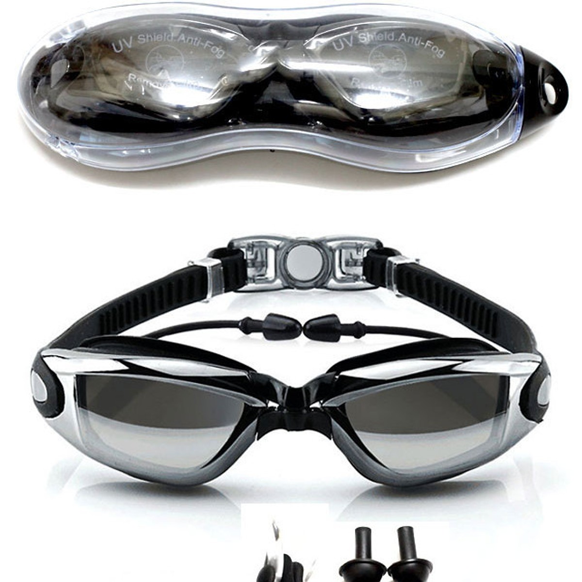 Kính bơi chống sương mù có nút bịt tai gồm Bịt Tai + Kẹp Mũi, kính bơi ngăn UV cao cấp. Tròng kính được làm từ chất liệu polycarbonate trong suốt, nhẹ, bền giúp người