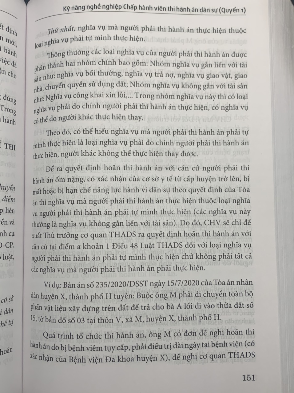 Kỹ năng nghề nghiệp Chấp hành viên thi hành án dân sự (Quyển 1) Tác giả: Ths. GV. Hoàng Thị Thanh Hoa - Ths. Hồ Quân Chính - TS. Nguyễn Văn Nghĩa Nhà xuất bản: Tư Pháp Năm phát hành: 12.2022 Khổ sách: 16*24cm Số trang: 600 Giới thiệu tóm tắt tác phẩm: Nhà Xuất bản Tư pháp và Nhóm tác giả: Ths. GV.Hoàng Thị Thanh Hoa, Ths. Hồ Quân Chính, TS. Nguyễn Văn Nghĩa xin trân trọng giới thiệu tới Quý bạn đọc cuốn sách mới “Kỹ năng nghề nghiệp Chấp hành viên Thi hành án Dân sự” Đây là cuốn sách chứa đựng những kỹ năng quan trọng và thiết yếu có giá trị tham khảo và ứng dụng cao đối với Chấp hành viên Thi hành án Dân sự trong quá trình tổ chức thi hành án. Cuốn sách dày 600 trang, kết cấu được xây dựng bám theo thủ tục THADS trên cơ sở cập nhật tất cả các văn bản pháp luật về THADS và các lĩnh vực pháp luật khác có liên quan được áp dụng đối với từng thủ tục một cách chi tiết giúp người đọc dễ dàng tra cứu. Những giá trị quý báu mà cuốn sách mang đến cho bạn đọc: ứng với mỗi tác nghiệp của Chấp hành viên đều được chỉ rõ cơ sở pháp lý; thủ tục thi hành án được phân tích chặt chẽ trên cơ sở quy định của pháp luật; cùng với những điểm nhấn cần lưu ý khi áp dụng pháp luật và những kinh nghiệm thực tiễn vào việc tổ chức thi hành án; trang bị những “kỹ năng mềm” cần thiết trong quá trình tổ chức thi hành án. Bên cạnh ý nghĩa là một cuốn sách “kỹ năng nghề” của Chấp hành viên, cuốn sách còn có giá trị tham khảo đối với những người làm công việc chuyên ngành Tư pháp như Kiểm sát viên, Thẩm phán, Thừa phát lại… và các học viên chuyên ngành Luật cũng như đông đảo Quý độc giả. Nhóm tác giả hy vọng cuốn sách “Kỹ năng nghề nghiệp Chấp hành viên thi hành án dân sự” sẽ là người bạn đồng hành tin cậy đối với đồng nghiệp công tác trong hệ thống Thi hành án dân sự và đông đảo Quý bạn đọc quan tâm! Giá sách là 260.000 đồng/cuốn.