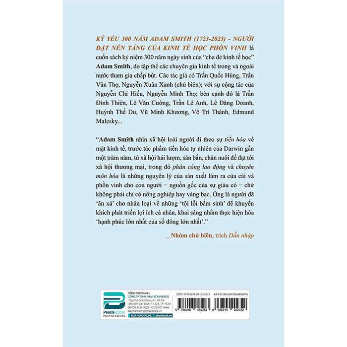 Kỷ yếu 300 năm Adam Smith (1723-2023) - Người đặt nền tảng của kinh tế học phồn vinh là cuốn sách được ra đời để kỷ niệm 300 năm ngày sinh của “cha đẻ” kinh tế học hiện đại Adam Smith (1723-2023), do Phanbook và NXB Đà Nẵng ấn hành. Đây là quyển sách đầu tiên về diện mạo và những đóng góp của ông cho lý thuyết kinh tế thế giới, do Trần Quốc Hùng - Trần Văn Thọ - Nguyễn Xuân Xanh chủ biên, với sự cộng tác, tham gia chấp bút của Nguyễn Chí Hiếu - Nguyễn Minh Thọ - Trần Lê Anh - Nguyễn Ngọc Anh - Nguyễn Tú Anh - Lê Văn Cường - Lê Đăng Doanh - Huỳnh Thế Du - Edmund Malesky - Emily Hamblin - Vũ Minh Khương - Hoàng Hải Vân…