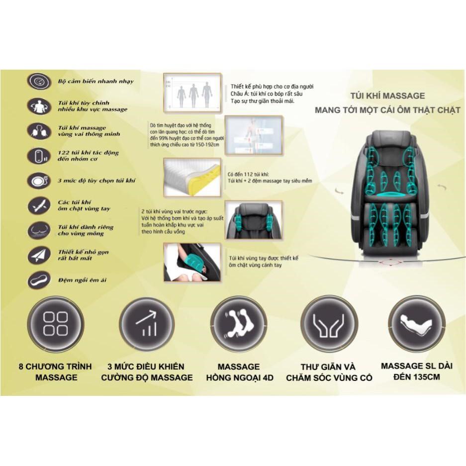 Chức năng 8 chương trình massage tự động toàn thân; tự động dò tìm huyệt đạo với hệ thống con lăn quang học; 112 túi khí với 3 mức độ tùy chọn thông minh tác động đến hầu hết các nhóm cơ trên cơ thể; hồng ngoại 4D; nâng dần và hạ dần tựa lưng, chân; massage bàn chân, xoa bóp từ ngoài vào trong, từ trong ra ngoài, vỗ, điều chỉnh lực xoa bóp và lực vỗ, massage khí nén cho bàn chân và mông.