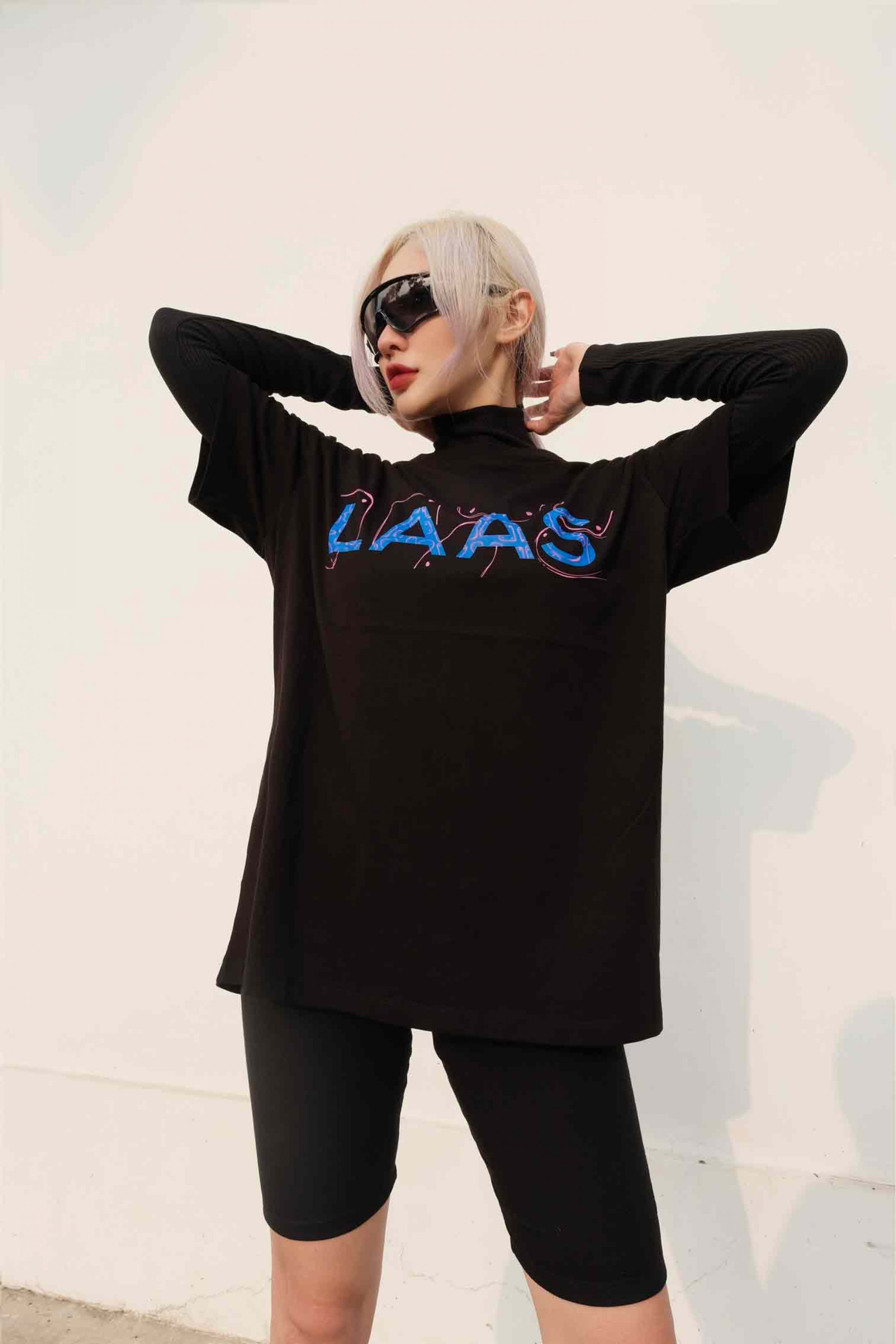 100% COTTON 2 CHIỀU, DÀY DẶN THOÁNG MÁT ÁO MÀU ĐEN FORM RỘNG ĐIỂM NHẤN HÌNH IN CHỮ LAAS MÀU XANH, HỒNG