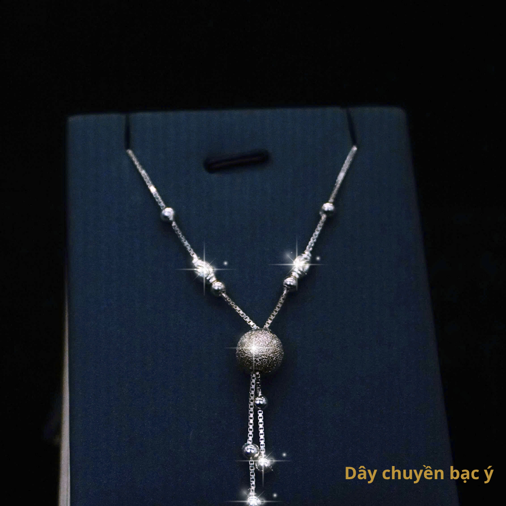 Đặc điểm: Đây là một chiếc lắc chân bạc Ý với thiết kế dạng chuỗi hạt độc đáo, kết hợp giữa các hạt bi bạc nhỏ và các hạt hình con thoi hoặc hạt được chạm khắc tinh xảo. Điểm nhấn chính là một quả cầu bạc lớn ở giữa, có bề mặt được xử lý để tạo hiệu ứng lấp lánh, có thể là hiệu ứng cát mịn hoặc được chạm khắc tinh xảo. Bên dưới quả cầu lớn là một chuỗi các hạt bi nhỏ hơn được sắp xếp thành tầng, tạo hiệu ứng rủ xuống mềm mại và uyển chuyển. Toàn bộ chiếc lắc chân mang lại vẻ đẹp hiện đại, cá tính và độc đáo.