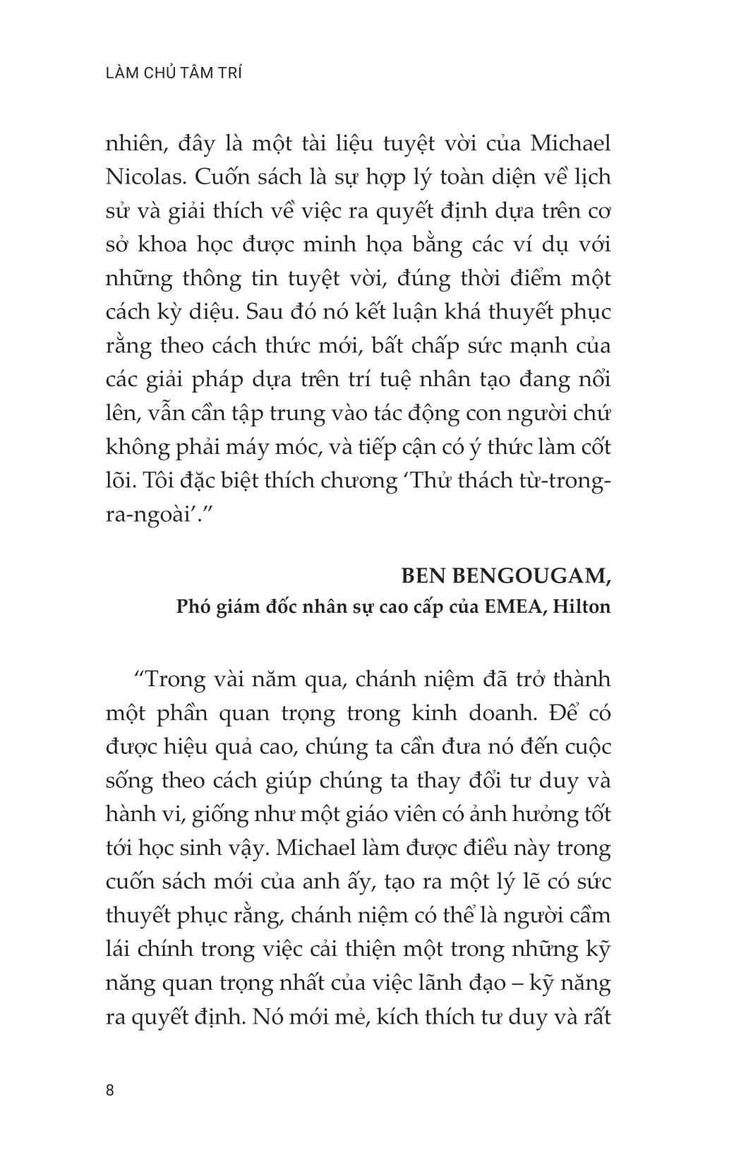 Cuốn sách này sẽ khiến bạn ngạc nhiên nếu bạn chưa bao giờ nhìn vào chiều sâu của sự ảnh hưởng mà thế giới bên trong tác động tới cách chúng ta nhận thức và đánh giá các sự kiện bên ngoài. Cuốn sách này sẽ giúp bạn làm điều đó. “Làm chủ tâm trí” giúp giải quyết không chỉ vấn đề “cái gì” mà còn “như thế nào” trong việc ra quyết định, trong đó hiệu quả là khi các vấn đề được cải thiện bắt đầu từ bên trong.