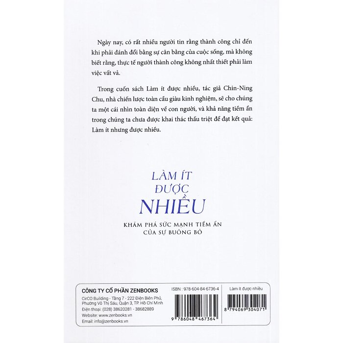 Ngày nay, có rất nhiều người tin rằng thành công chỉ đến khi phải đánh đổi bằng sự cân bằng của cuộc sống, mà không biết rằng, thực tế người thành công không nhất thiết phải làm việc vất vả. Trong cuốn sách “Làm ít được nhiều”, tác giả Chin-Ning Chu, nhà chiến lược toàn cầu giàu kinh nghiệm, sẽ cho chúng ta một cái nhìn toàn diện về con người, và khả năng tiềm ẩn trong chúng ta chưa được khai thác thấu triệt để đạt kết quả: Làm ít nhưng được nhiều.