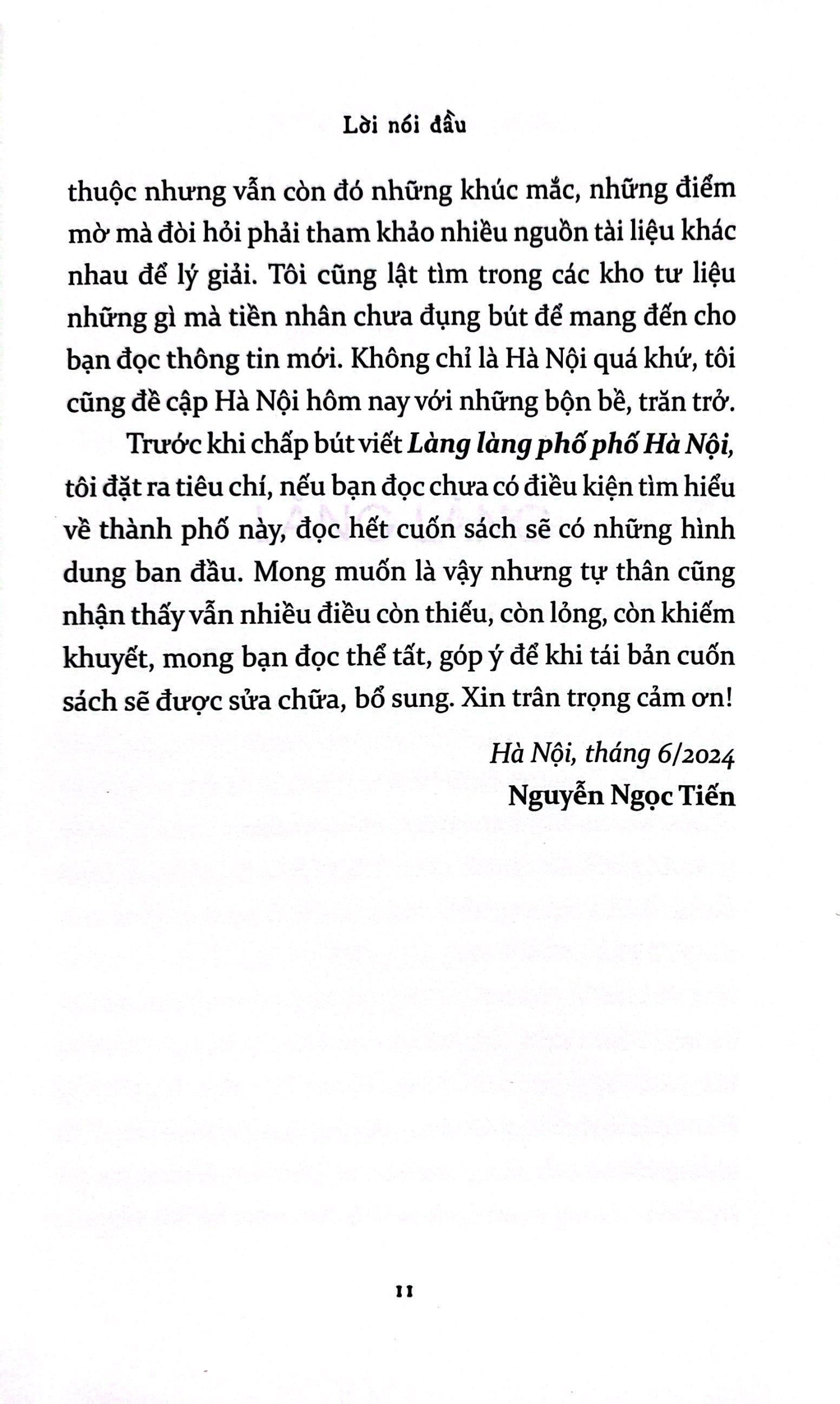 Trong số các tỉnh thành ở Việt Nam, ít có nơi nào mà những biến đổi về hành chính, dân cư, văn hóa lại diễn ra một cách phức tạp, xếp chồng nhiều lớp lên nhau như ở Hà Nội, từ hàng nghìn năm trước cho đến tận ngày hôm nay. Thế nhưng, bất chấp lịch sử bề bộn đó, cũng ít nơi nào mà người ta lại quan tâm đến "căn tính" của một thành phố đến vậy: gốc Hà Nội là gì, người Hà Nội là như thế nào? Đối với Nguyễn Ngọc Tiến, Hà Nội đã không còn xa lạ, nếu không muốn nói đã "nhẵn mặt" trong các trang viết của ông. Nhưng mỗi lần đi, thấy và viết về Hà Nội, Nguyễn Ngọc Tiến luôn gợi mở những góc nhin rất mới, rất lạ và thú vị. Trong cuốn sách lần này, Làng làng phố phố Hà Nội, đó là hình ảnh một thành phố vừa quê mùa, cổ kính với các lễ hội, các làng nghề truyền thống, vừa hiện đại, phồn hoa khi từng là kinh đô của các triều đại phong kiến, là thủ phủ của Liên bang Đông dương thuôc Pháp, và là thủ đô của nước Việt Nam hôm nay. Làng và phố vừa tương phản với nhau, song song tồn tại làm nên diện mạo rất đặc biệt của Hà Nội, mà nếu thiếu đi một, hoặc nếu cố tình loại bổ một, thì đó không còn là Hà Nội.