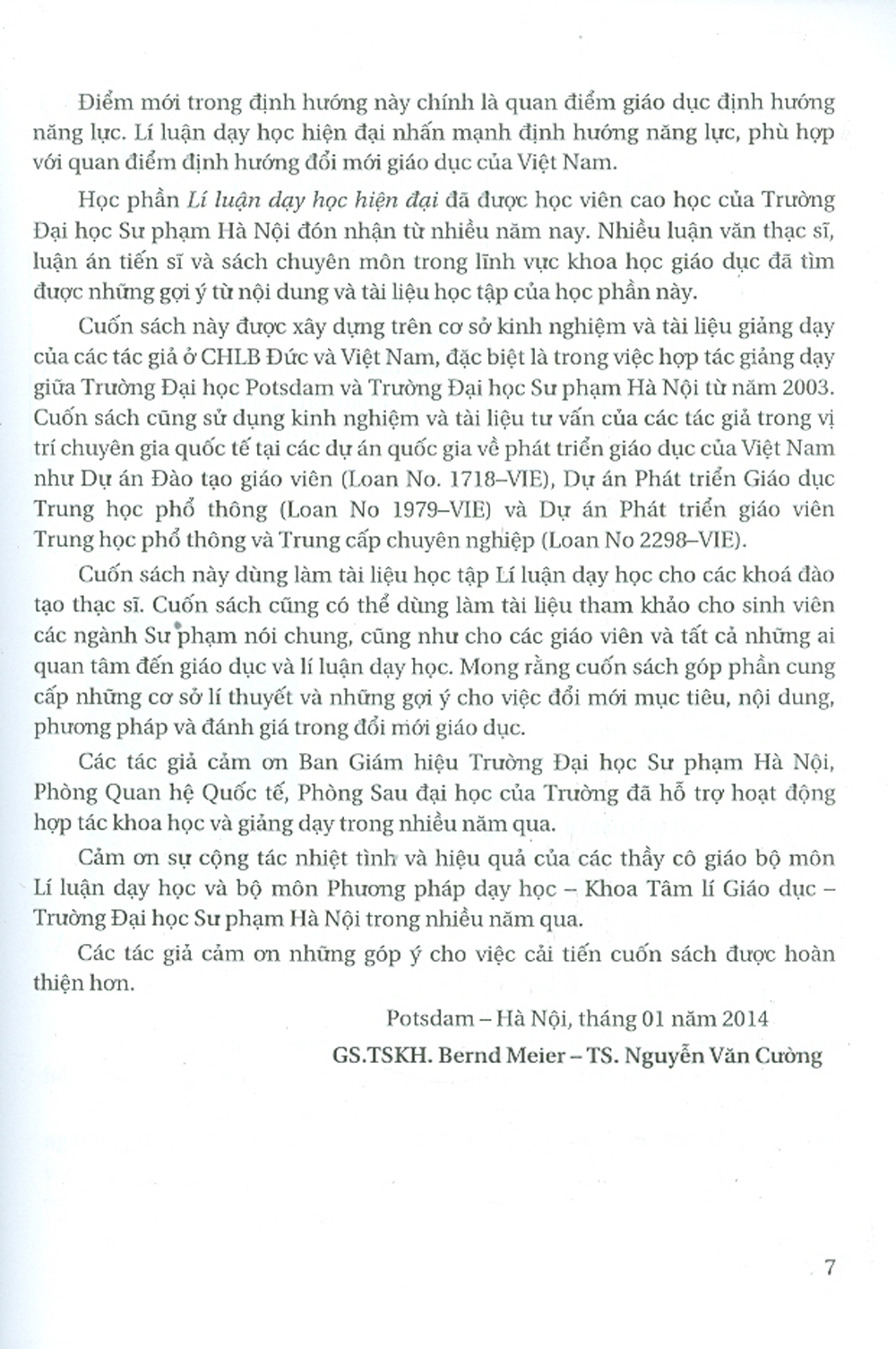 Lí luận dạy học là lí thuyết khoa học về việc dạy và học, là một lĩnh vực trung tâm của khoa học giáo dục. Trong chương trình đào tạo giáo viên, lí luận dạy học có một vị trí quan trọng trong hệ thống các môn học khoa học giáo dục, góp phần hình thành năng lực nghề nghiệp của người giáo viên, bao gồm các năng lực giáo dục và dạy học, năng lực chẩn đoán, đánh giá và năng lực phát triển nghề nghiệp. Trong chương trình đào tạo giáo viên bậc Cử nhân, sinh viên được đào tạo về lí luận dạy học đại cương, lí luận dạy học chuyên ngành cũng như thực tiễn dạy học thông qua các chương trình thực tập sư phạm. Trong chương trình đào tạo giáo viên trình độ Thạc sĩ, học viên tiếp tục được đào tạo sâu hơn về lí luận dạy học. Học phần Lí luận dạy học hiện đại nhằm giúp học viên: Mở rộng kiến thức lí luận dạy học, làm quen với một số lí thuyết, quan điểm, phương pháp dạy học theo cách tiếp cận hiện đại. Có khả năng vận dụng các kiến thức lí luận dạy học hiện đại trong việc lập kế hoạch, thực hiện và đánh giá các quá trình dạy học. Có khả năng tiếp tục nghiên cứu lí luận và thực tiễn dạy học cũng như tham gia đổi mới hoạt động dạy học và phát triển nhà trường. Nội dung của cuốn sách đề cập đến các chủ đề cơ bản của lí luận dạy học đại cương. Nội dung cụ thể của từng chương là sự mở rộng và đi sâu so với chương trình đào tạo ở bậc Cử nhân, những cách tiếp cận mới từ kinh nghiệm quốc tế. Trong sách có thể có những quan điểm, khái niệm khác với cách hiểu hiện nay của học viên, thông qua đó giúp người học thấy được sự đa dạng trong lí luận dạy học. Trong quá trình học tập trên lớp, với quỹ thời gian có hạn, giảng viên và học viên có thể thỏa thuận đi sâu vào một số chủ đề. Các chủ đề còn lại dành cho hoạt động tự nghiên cứu của học viên.