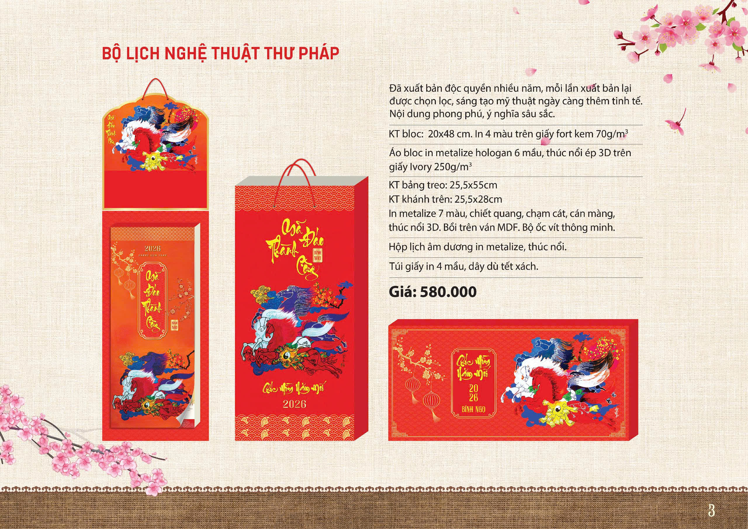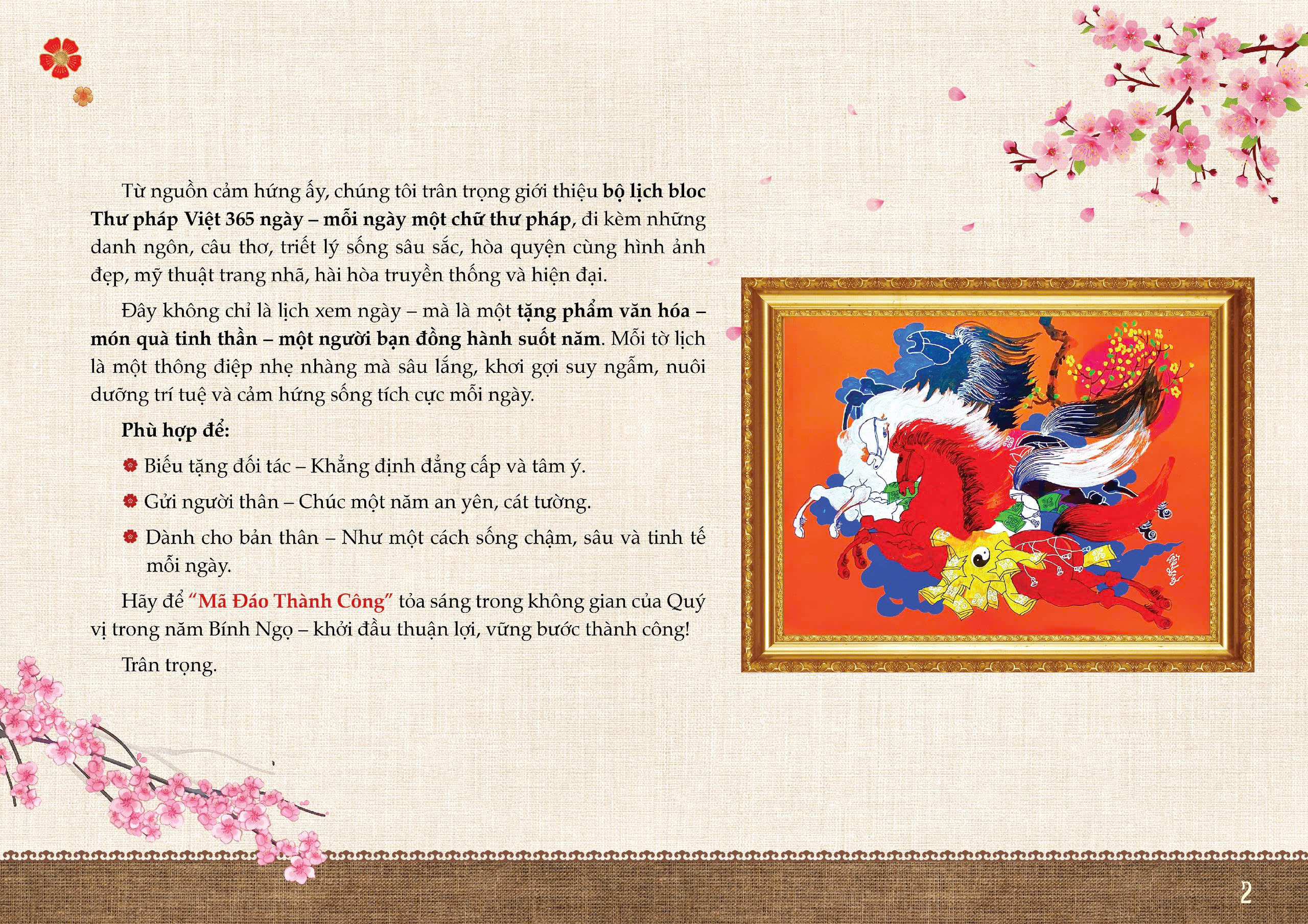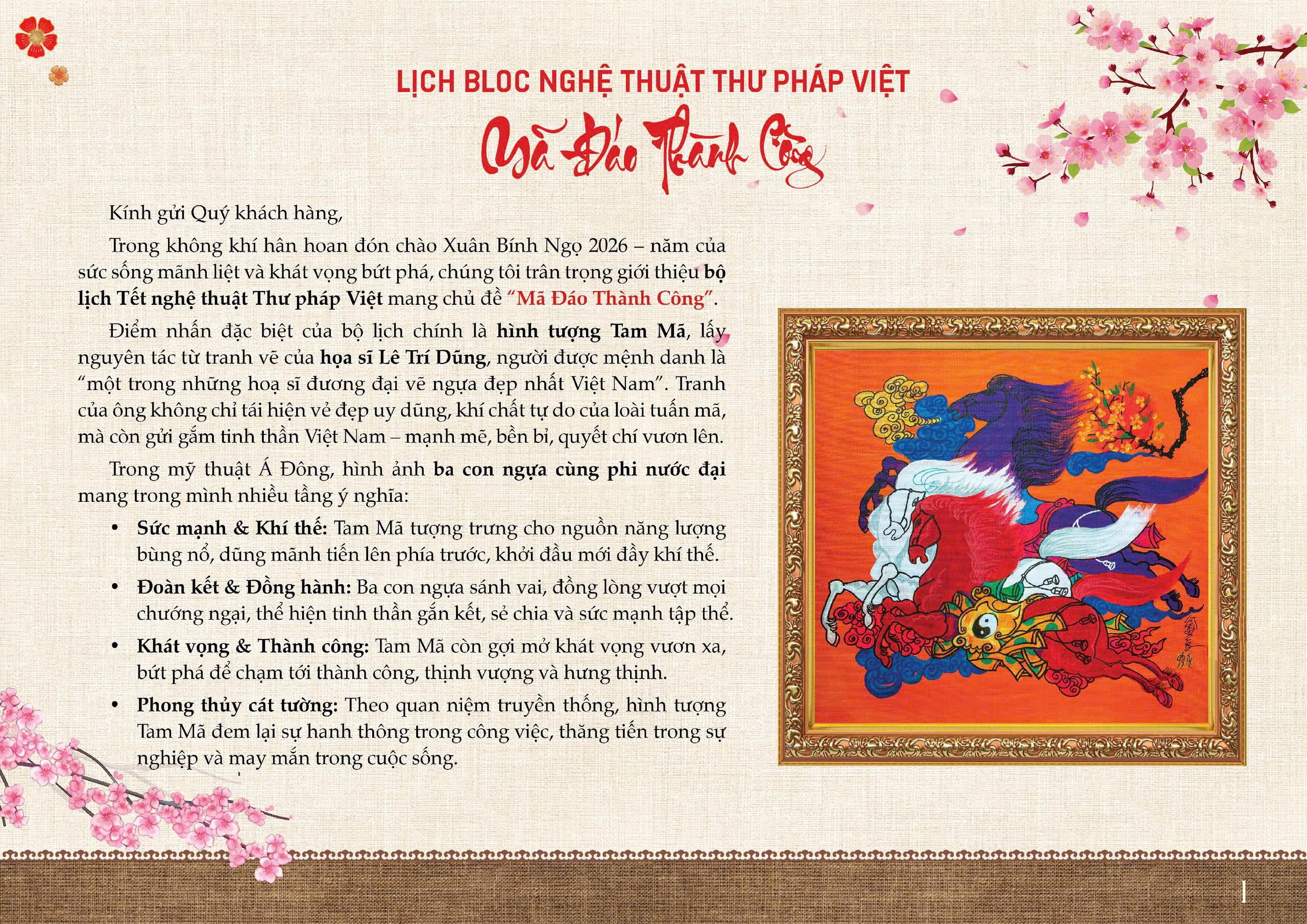 Kính gửi Quý khách hàng,   Trong không khí hân hoan đón chào Xuân Bính Ngọ 2026 – năm của sức sống mãnh liệt và khát vọng bứt phá, chúng tôi trân trọng giới thiệu bộ Lịch Tết nghệ thuật Thư pháp Việt mang chủ đề “Mã Đáo Thành Công”.   Điểm nhấn đặc biệt của bộ lịch chính là hình tượng Tam Mã, lấy nguyên tác từ tranh vẽ của họa sĩ Lê Trí Dũng, người được mệnh danh là “một trong những họa sĩ đương đại vẽ ngựa đẹp nhất Việt Nam”. Tranh của ông không chỉ là hiện vẻ đẹp uy dũng, khí chất tự do của loài tuấn mã, mà còn gửi gắm tinh thần Việt Nam – mạnh mẽ, bền bỉ, quyết chí vươn lên. Trong mỹ thuật Á Đông, hình ảnh ba con ngựa cùng phi nước đại mang trong mình nhiều tầng ý nghĩa: Sức mạnh & Khí thế, Đoàn kết & Đồng lòng, Khát vọng & Thành công, Phong thủy cát tường Từ nguồn cảm hứng ấy, chúng tôi trân trọng giới thiệu bộ lịch bloc Thư pháp Việt 365 ngày – mỗi ngày một chữ thư pháp, đi kèm những danh ngôn, câu thơ, triết lý sống sâu sắc, hòa quyện cùng hình ảnh đẹp, mỹ thuật trang nhã, hài hòa truyền thống và hiện đại. Đây không chỉ là lịch xem ngày – mà là một tặng phẩm văn hóa – món quà tinh thần – một người bạn đồng hành suốt năm. Mỗi tờ lịch là một thông điệp nhẹ nhàng mà sâu lắng, khơi gợi suy ngẫm, nuôi dưỡng trí tuệ và cảm hứng sống tích cực mỗi ngày. Hãy để “Mã Đáo Thành Công” tỏa sáng trong không gian của Quý vị trong năm Bính Ngọ – khởi đầu thuận lợi, vững bước thành công!