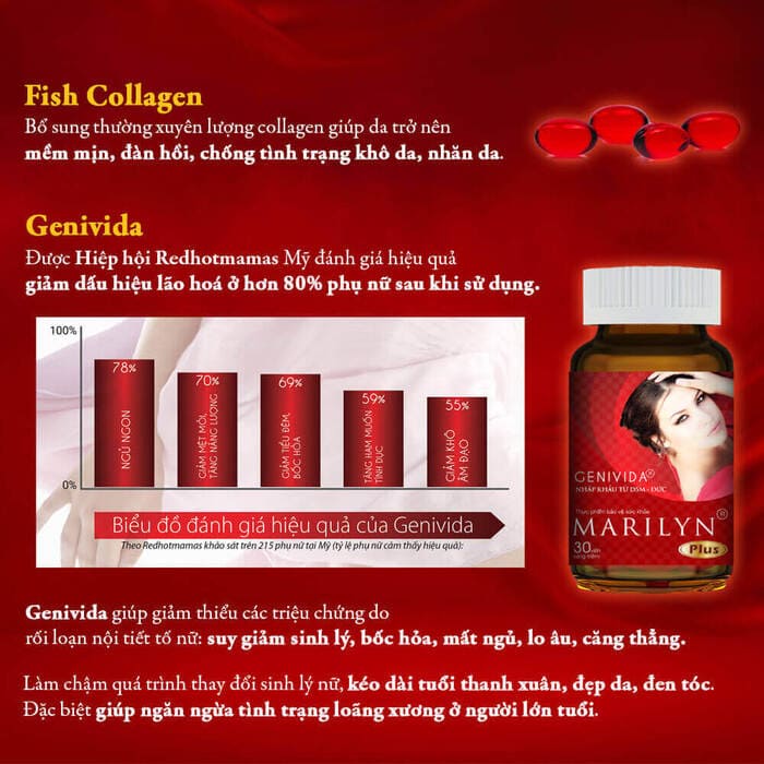 Mua tại TiktokVIÊN UỐNG CÂN BẰNG NỘI TIẾT TỐ, CẢI THIỆN SINH LÝ NỮ MARILYN PLUS Với sự kết hợp giữa các thành phần cải thiện nội tiết tố nữ và làm đẹp da cao cấp, Viên uống Cân Bằng Nội Tiết Tố, Cải Thiện Sinh Lý Marilyn là giải pháp hàng đầu dành cho phụ nữ trong giai đoạn tiền mãn kinh, mãn kinh, phụ nữ sau sinh và rối loạn nội tiết tố nữ. Không chỉ cải thiện sinh lý nữ, sản phẩm còn giảm thiểu các triệu chứng của tiền mãn kinh, mãn kinh như mất ngủ, bốc hỏa, rụng tóc, lo â, đồng thời làm đẹp da, mờ thâm nám và bảo vệ tim mạch. *Bao bì sản phẩm có thể thay đổi theo từng đợt nhập hàng HIỆU QUẢ RÕ RỆT CHỈ SAU 45 NGÀY SỬ DỤNG! GENIVIDA BÍ MẬT TẠO NÊN SỨC QUYẾN RŨ CỦA PHÁI ĐẸP